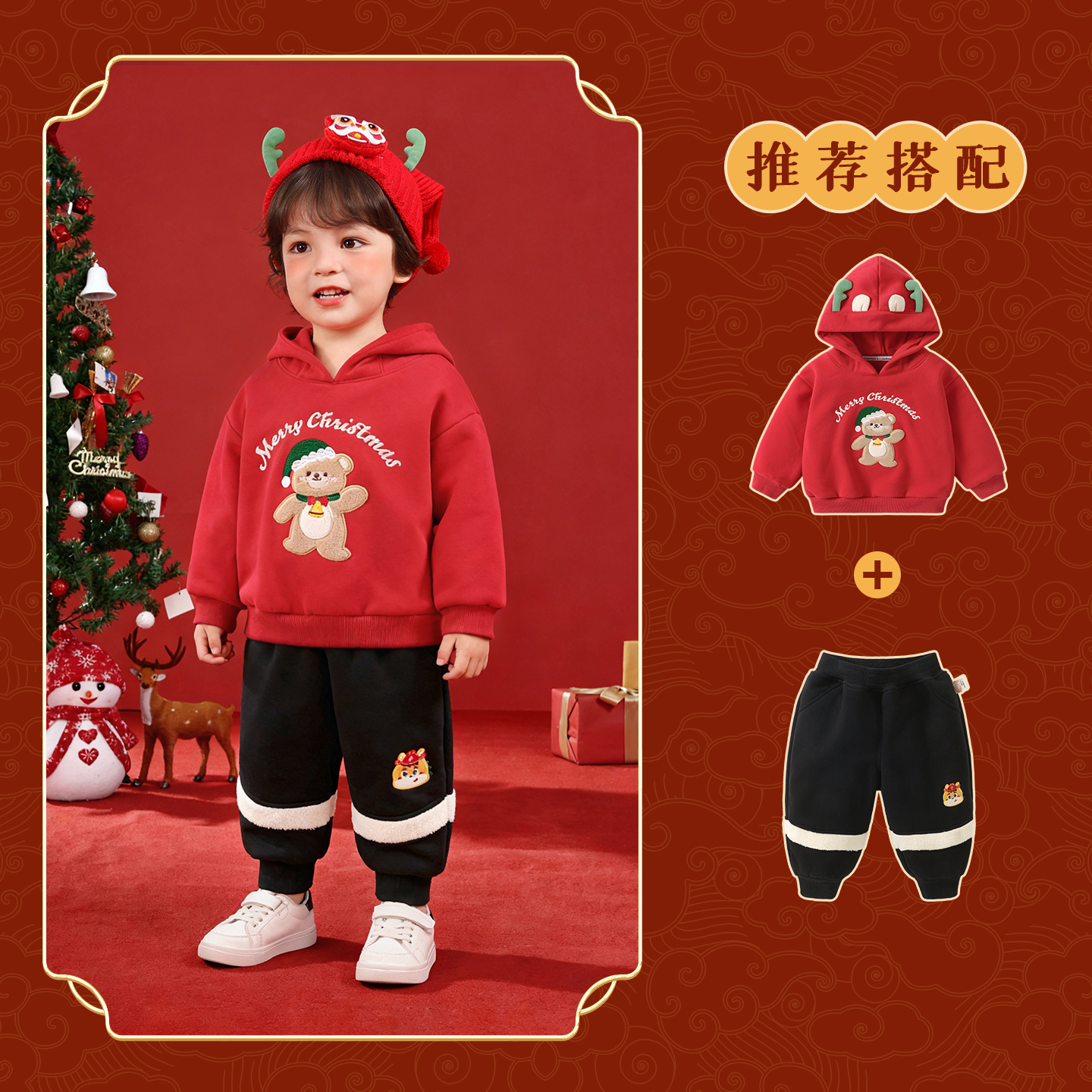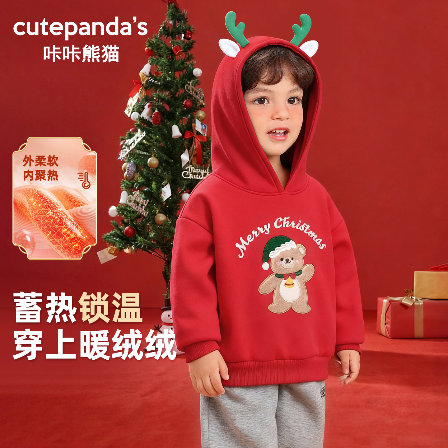 咔咔熊猫婴儿衣服儿童圣诞连帽衫 男童女童红色卡通卫衣加绒潮 冬装