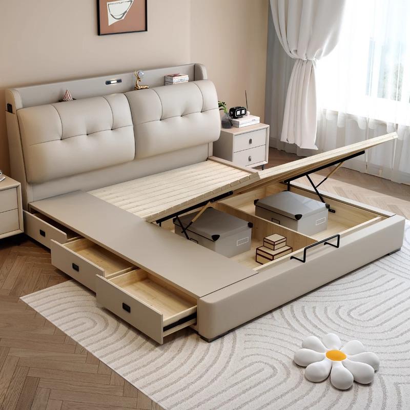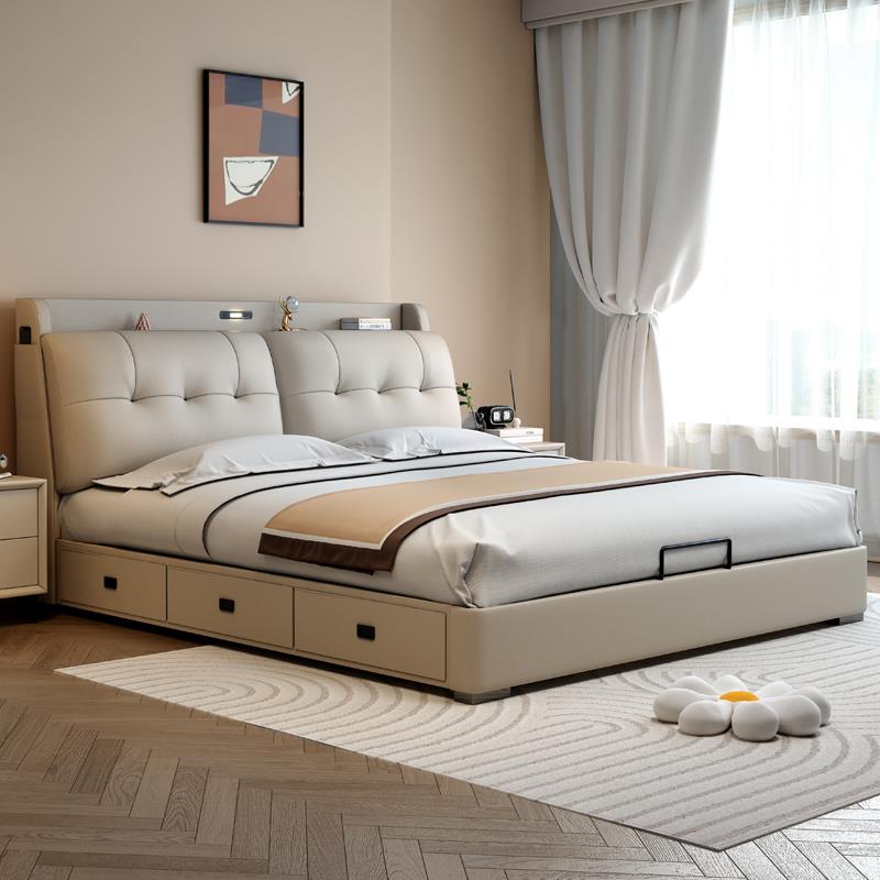 子博头层牛皮真皮储物床主卧大床意式 现代简约轻奢高端大气皮艺床