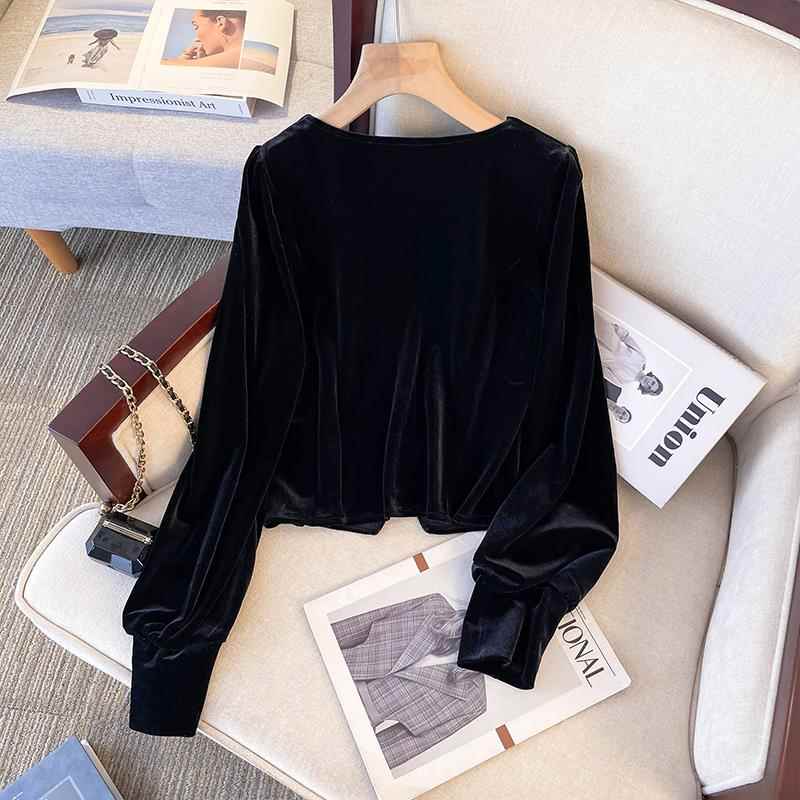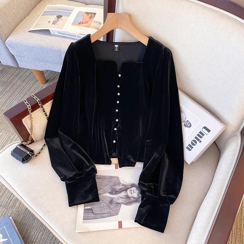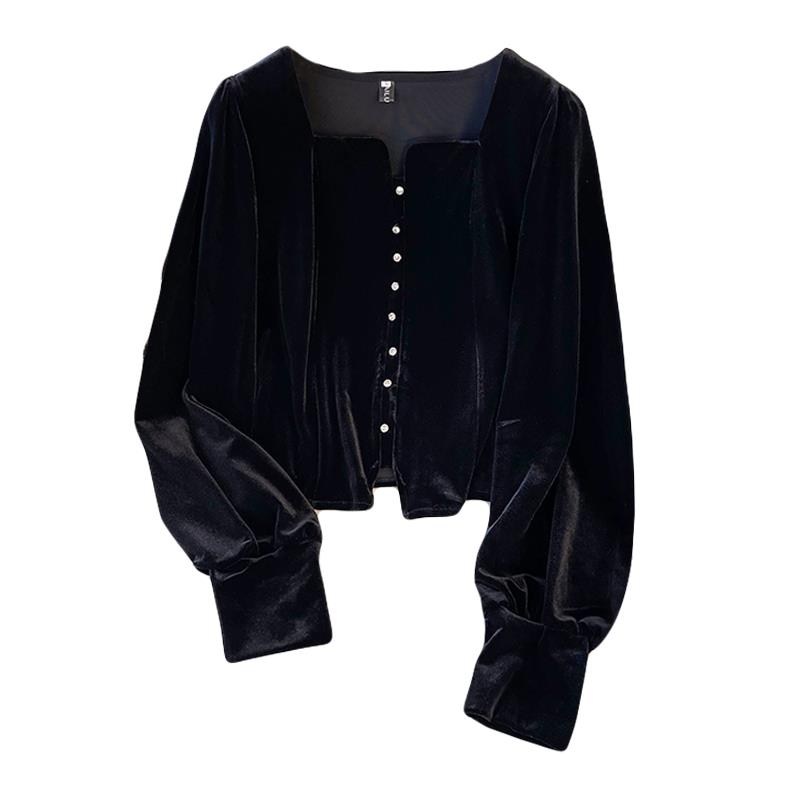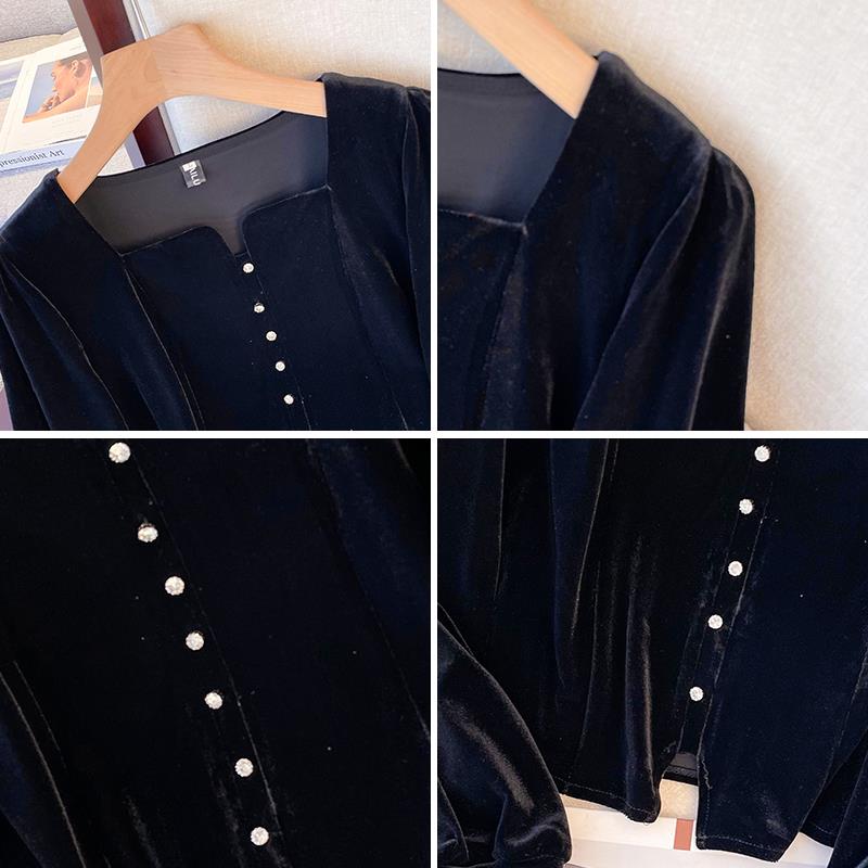 方领正肩黑色金丝绒衬衫 胖mm打底衫 女装 大码 上1012z 新款 秋冬法式