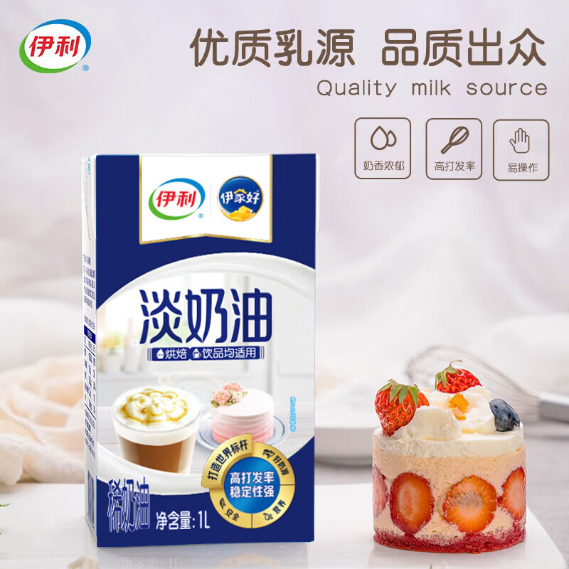 伊利淡奶油1L动物奶油家用蛋糕甜点蛋挞烘焙裱花材料易打发