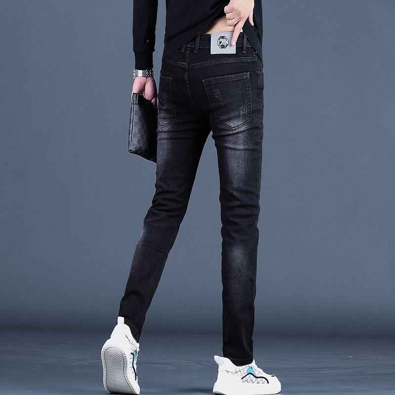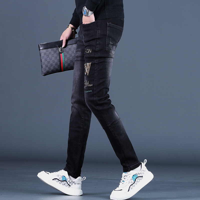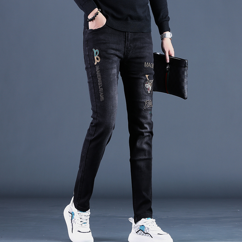 高档刺绣牛仔裤 2025年新款 男士 修身 子潮 秋季 休闲潮牌黑色小脚裤 款