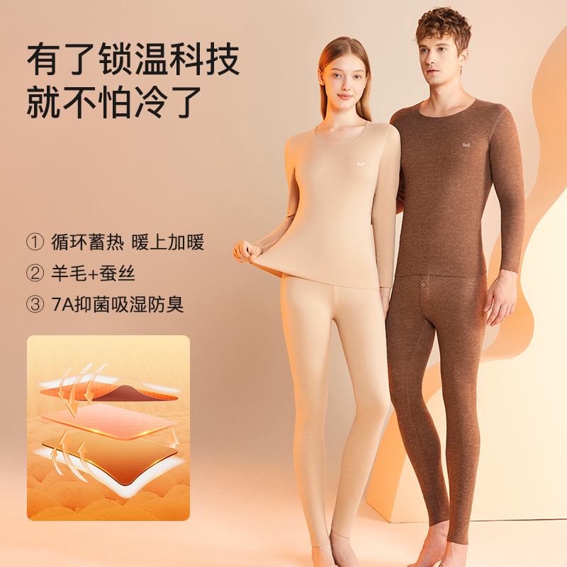 男女打底 套装 猫人情侣保暖内衣羊绒蚕丝发热无痕2025新款 秋衣秋裤