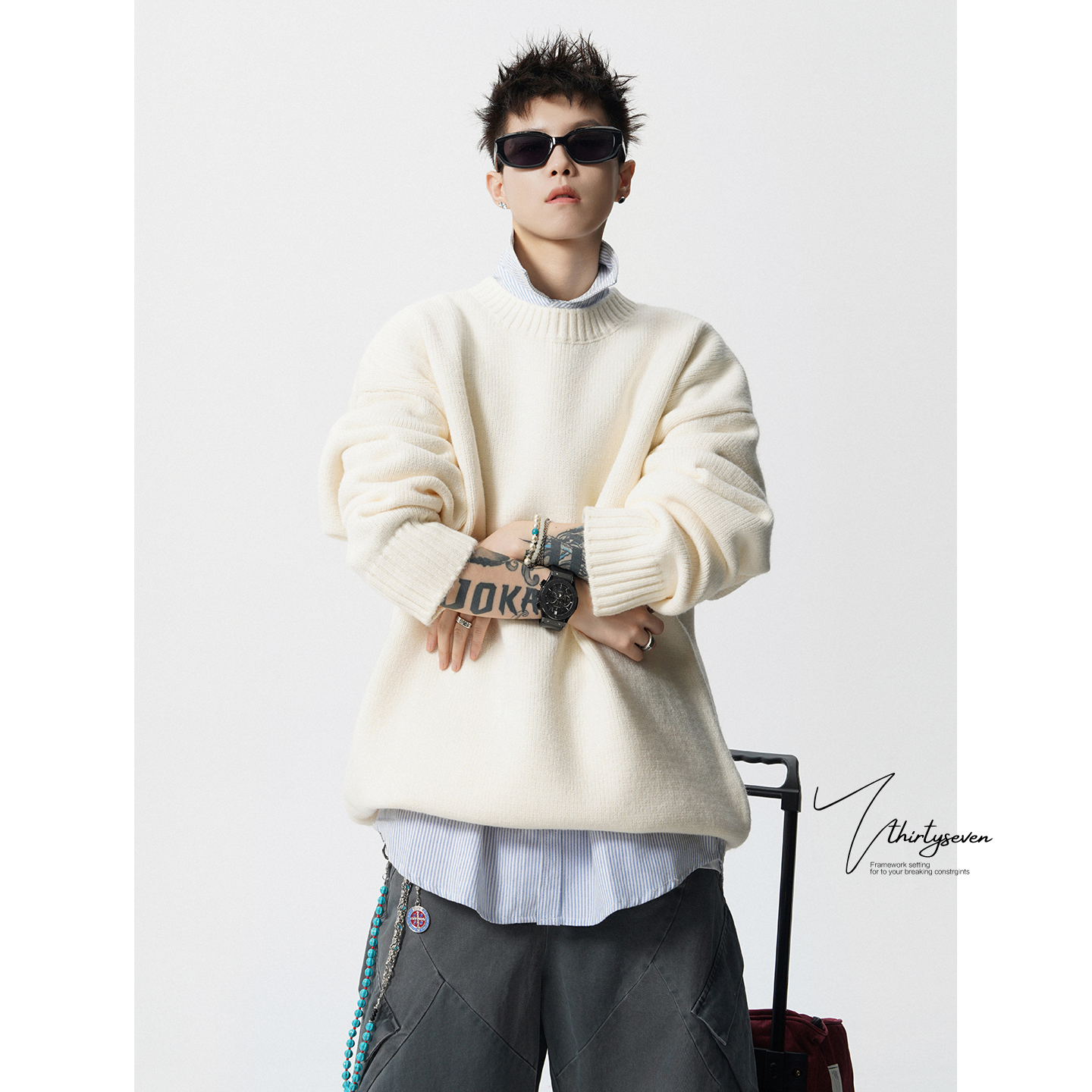 慵懒松弛感内搭毛衣 美式 V37老钱风复古棕色罗纹圆领针织衫 男秋季