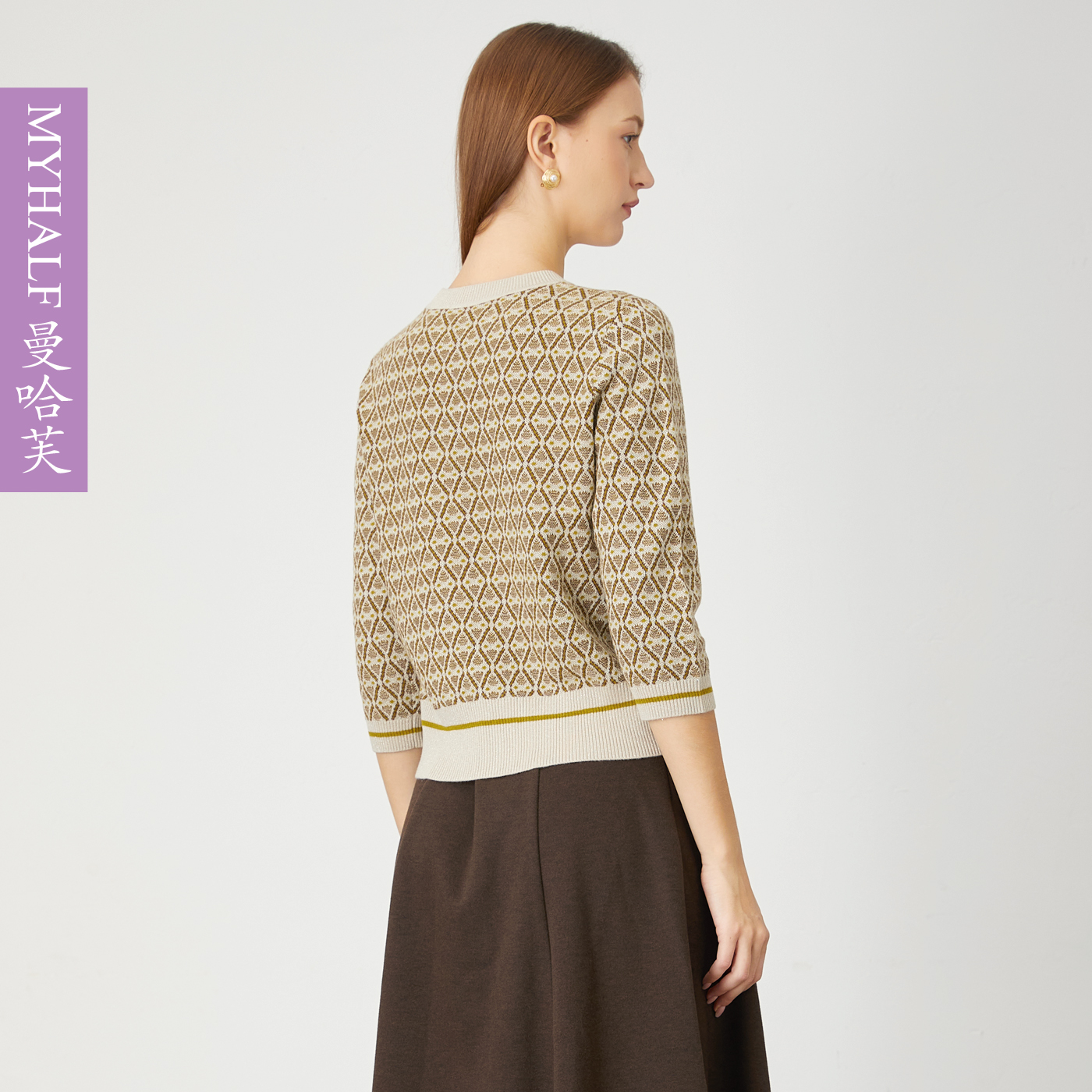 九分袖 曼哈芙亲肤经典 老花气质休闲老钱风毛衣绵羊毛针织上衣短款