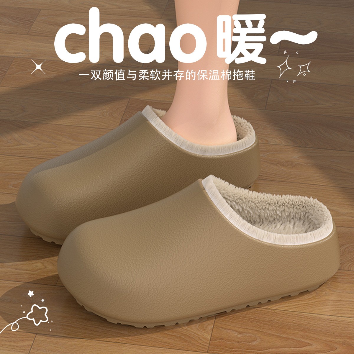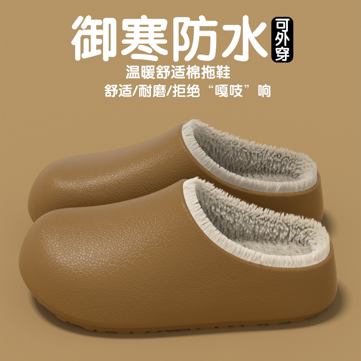 外穿保暖居家毛绒厚底防滑情侣棉鞋 2025新款 男 女秋冬季 防水棉拖鞋