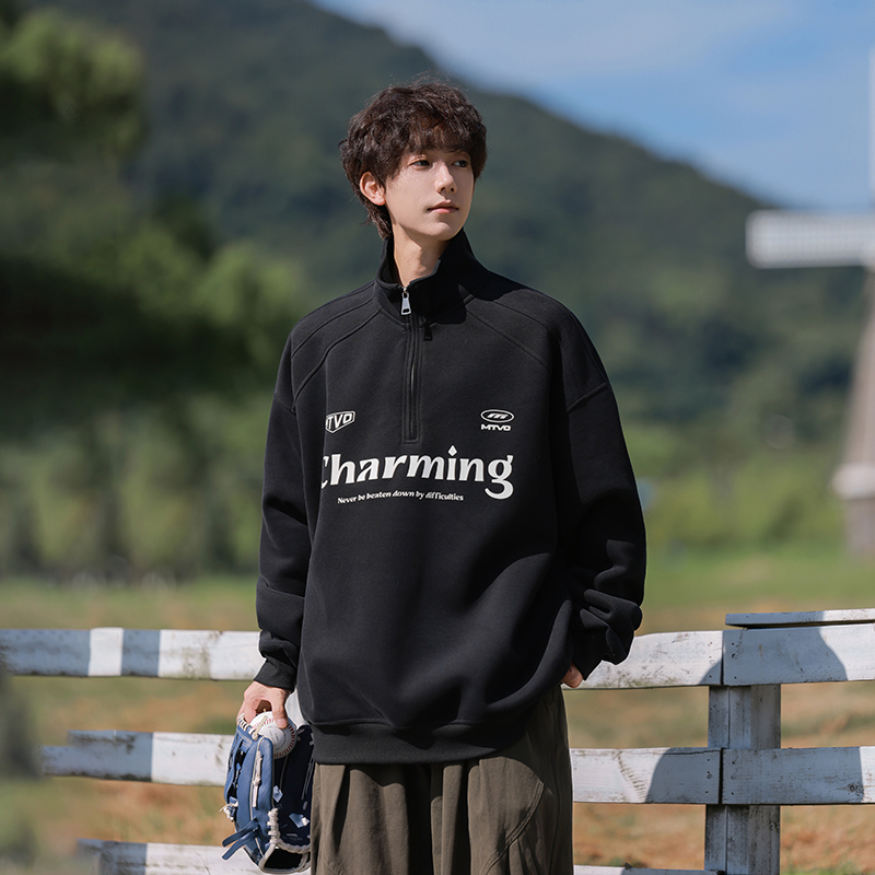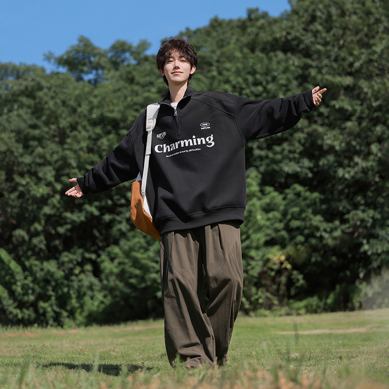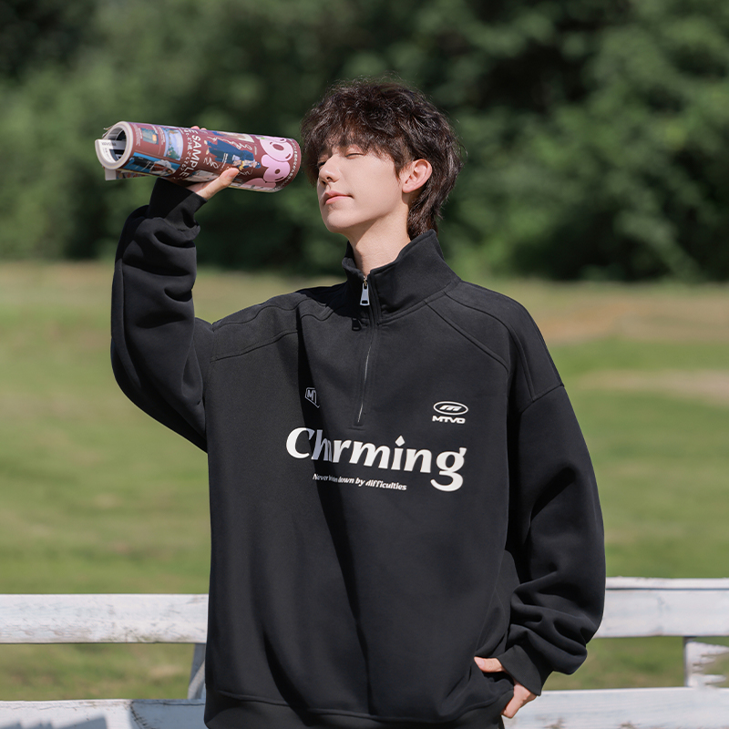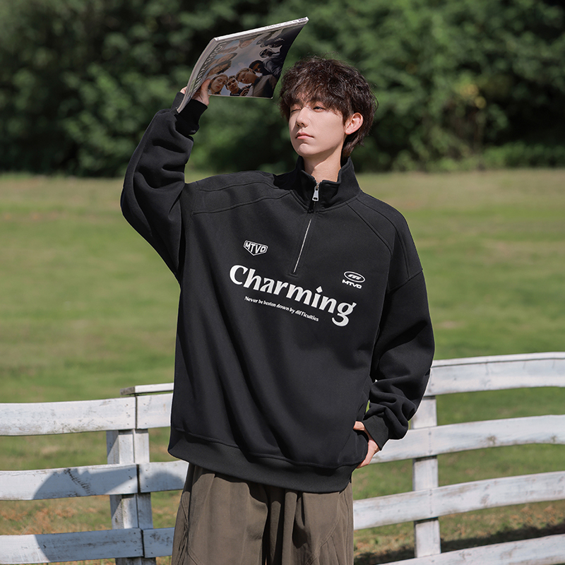 迈特优重磅半拉链立领卫衣男生黑色秋季 宽松套头外套女 情侣款