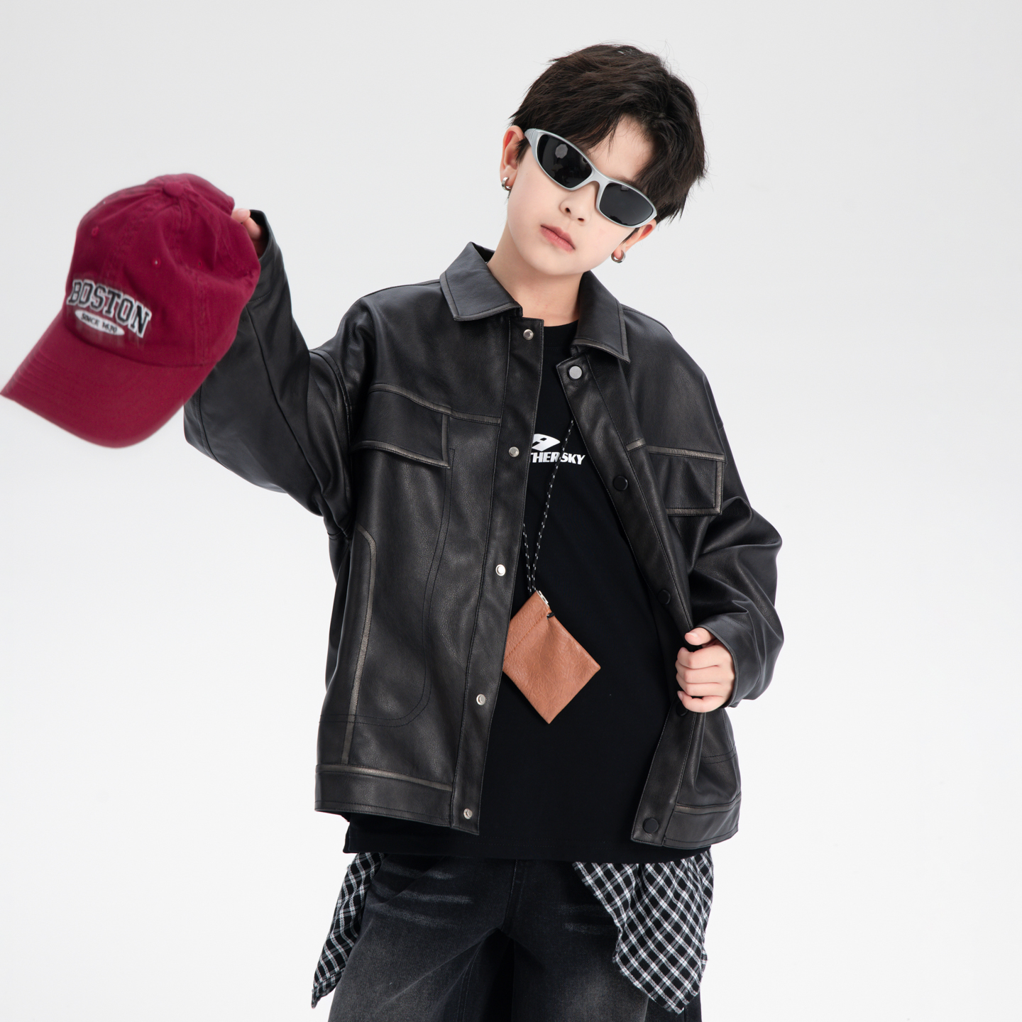 男童秋季 青少年儿童春秋防水免洗夹克潮 痞帅复古皮衣外套2025新款
