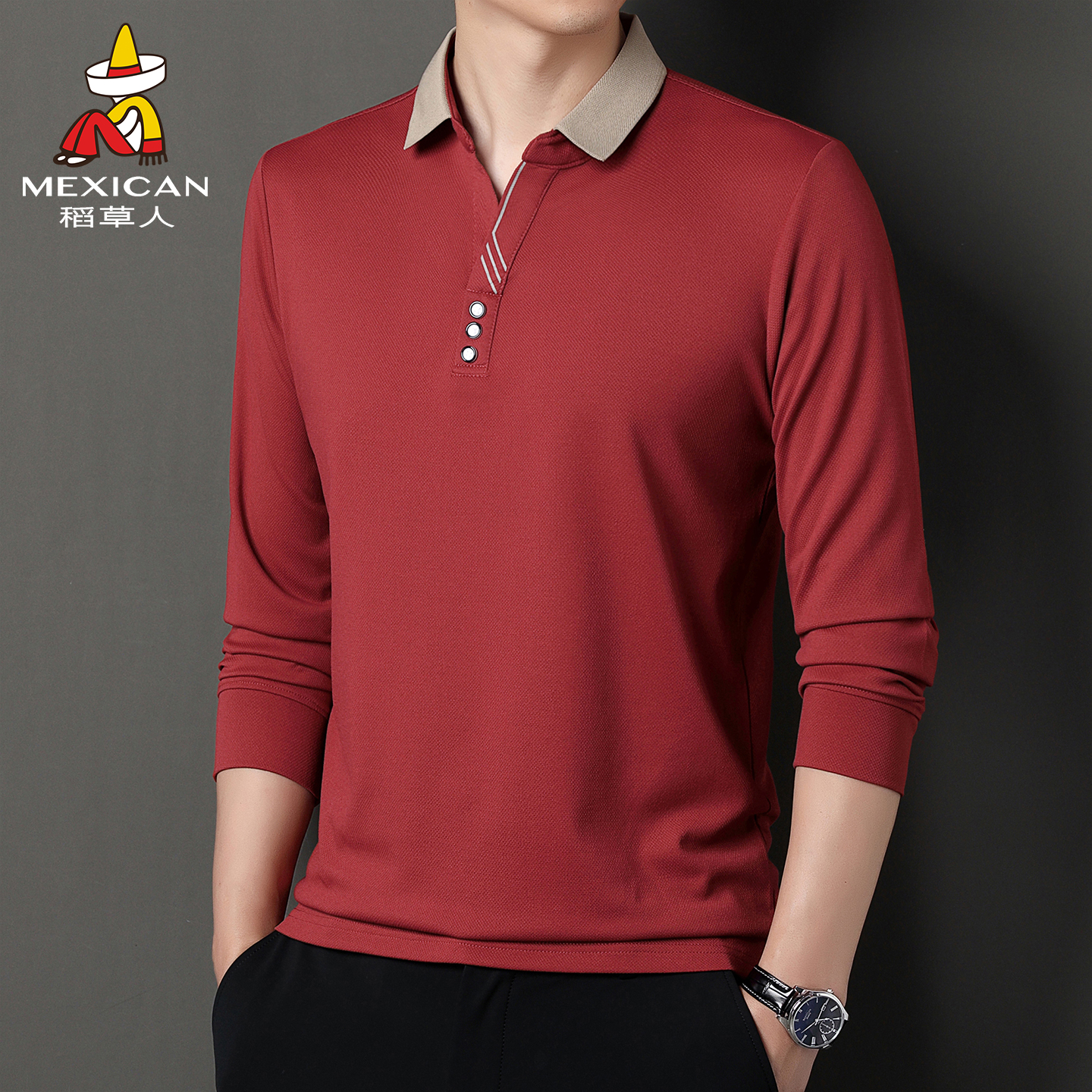 t恤男士 宽松翻领体恤打底衫 春秋季 爸爸装 中老年POLO衫 稻草人长袖
