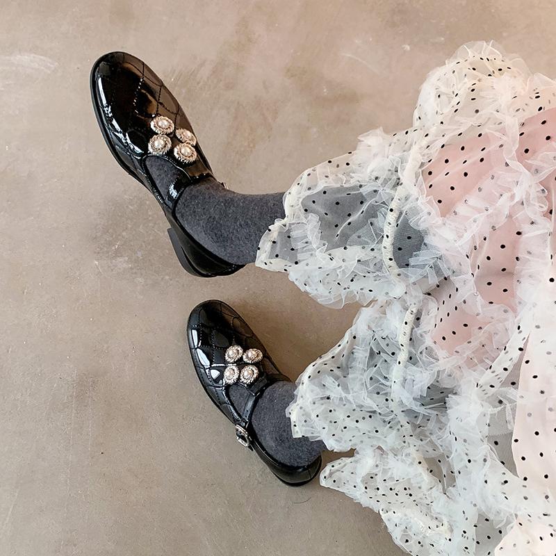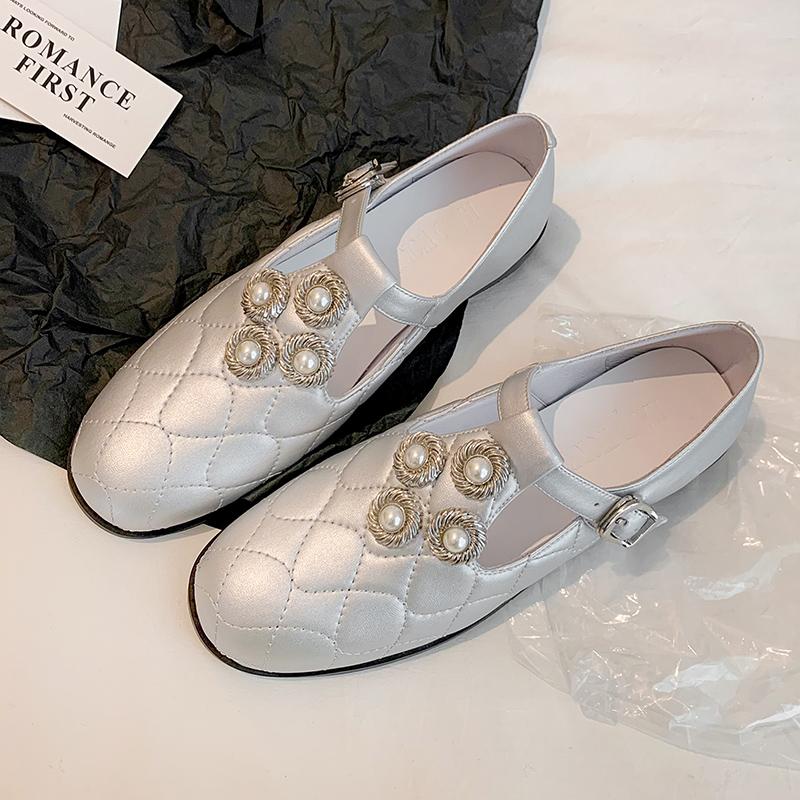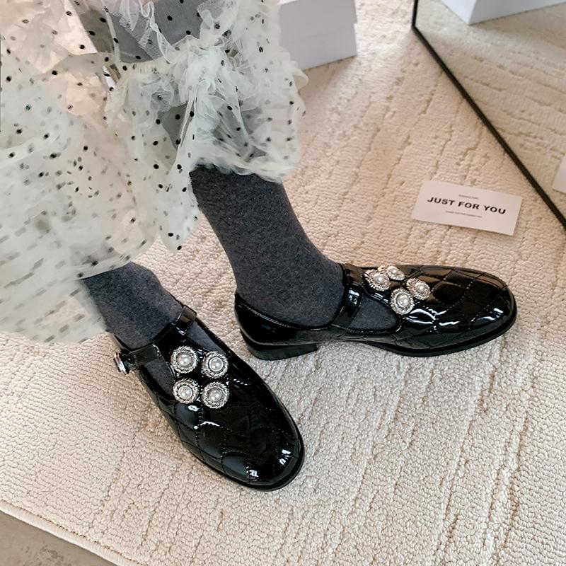 女鞋 一脚蹬小皮鞋 圆头珍珠菱格纹花朵扣带玛丽珍鞋 真皮日系乐福鞋
