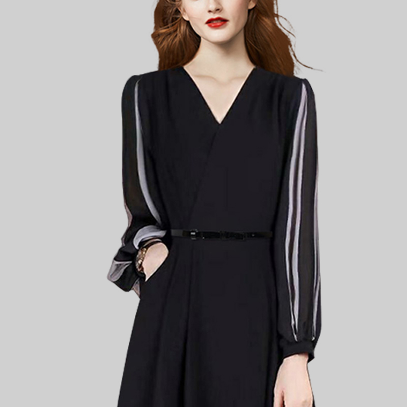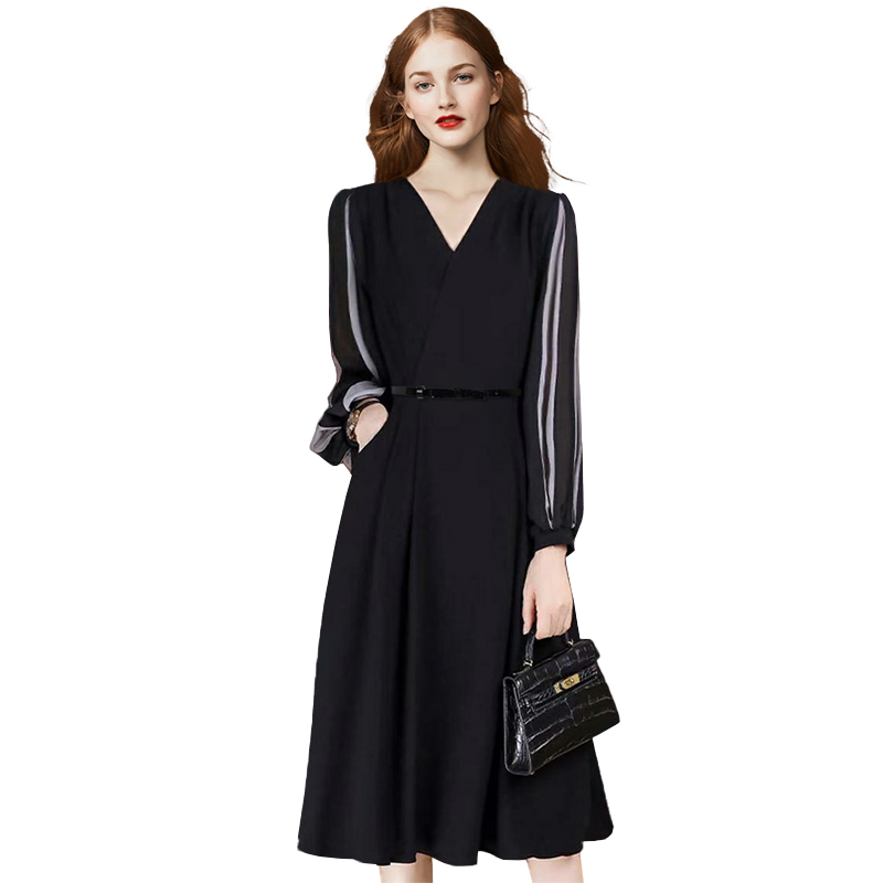 新款 朗姿纯羊毛v领收腰显瘦针织长裙设计感连衣裙冬季 免定金