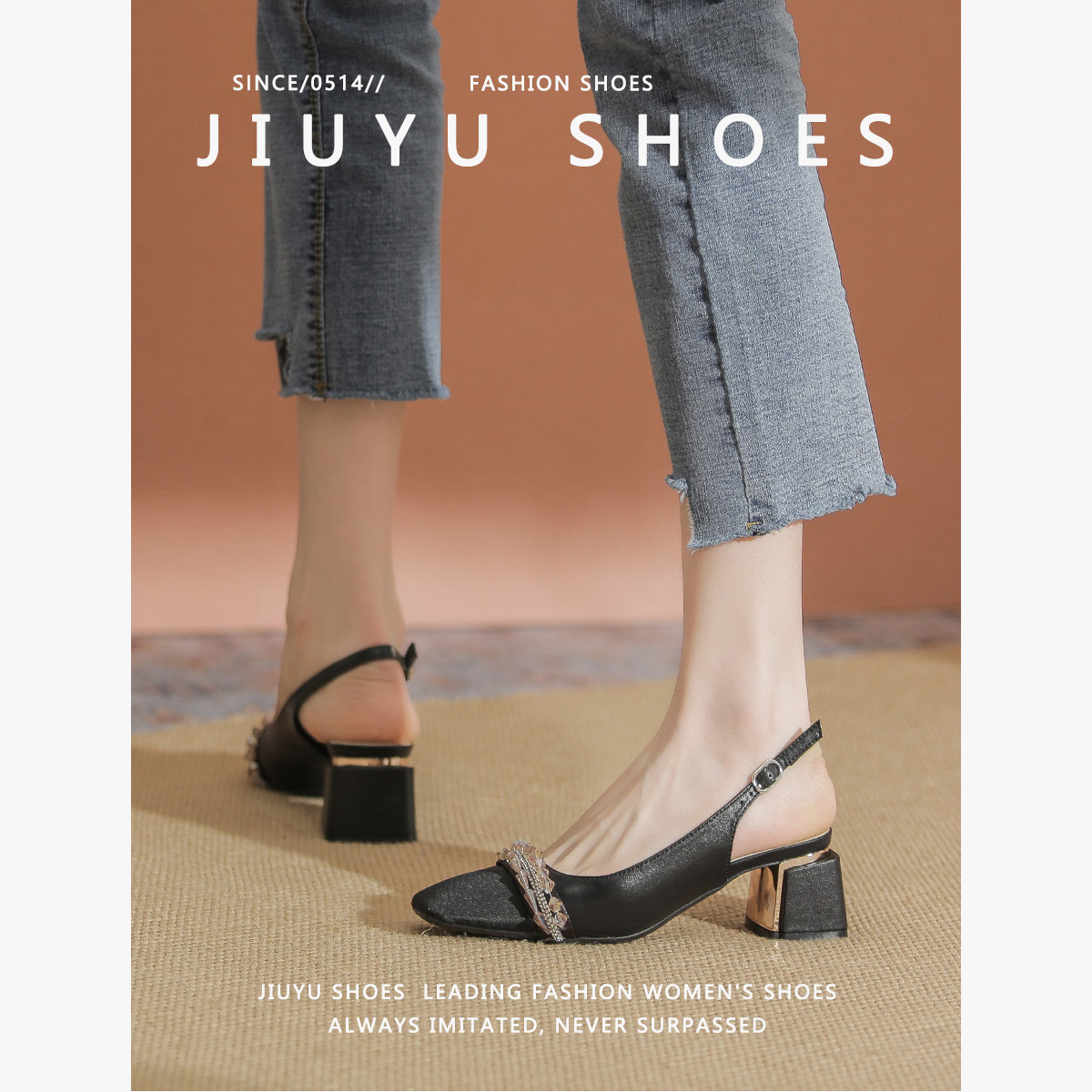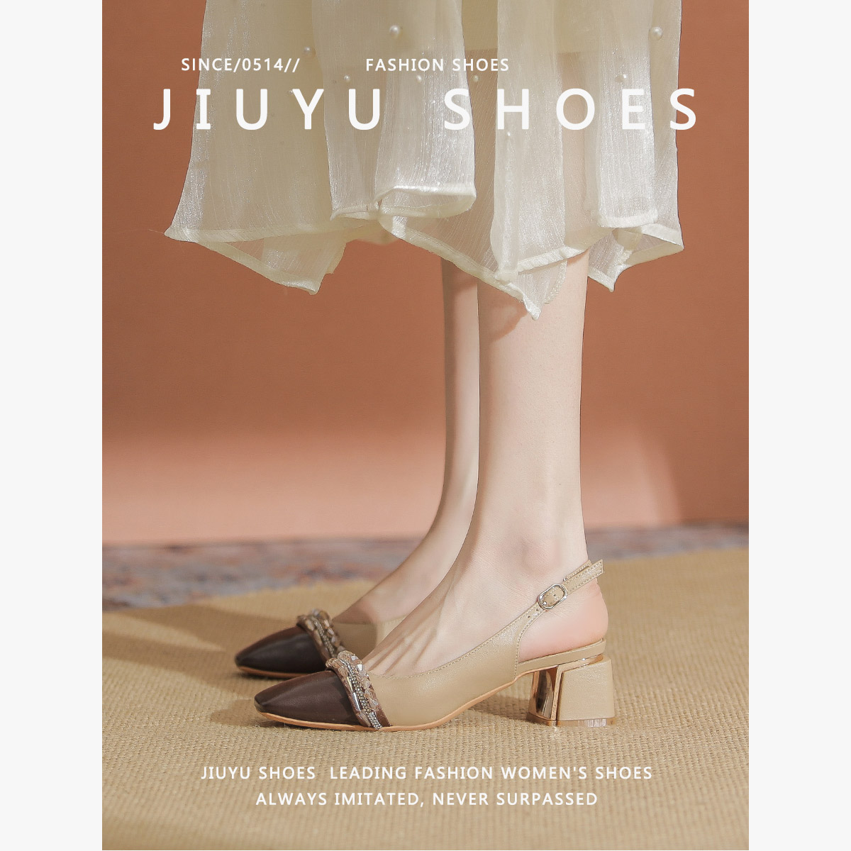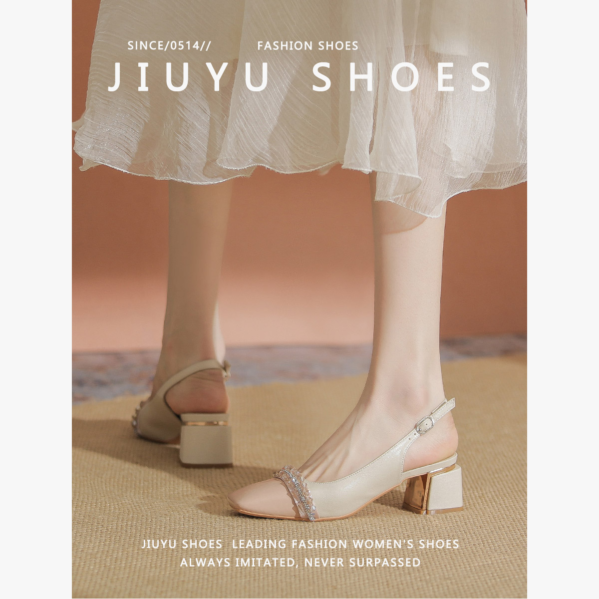 后空粗跟半包头单鞋 法式 女夏中跟方头小香风杏色水钻软皮夏季 凉鞋