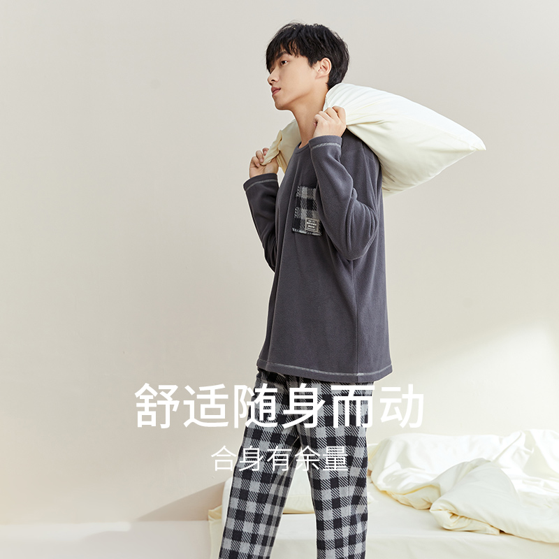 摇粒绒居家服加厚保暖套装 秋鹿 冬季 毛绒睡衣男款 清仓仅剩大码