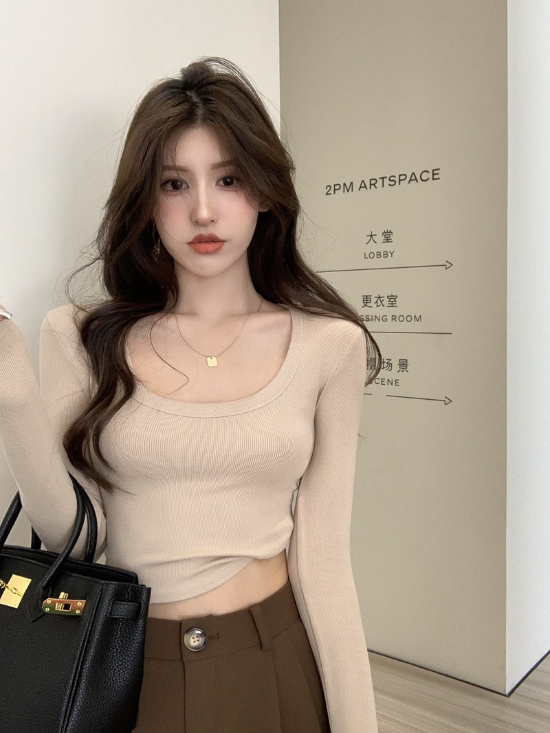 辣妹修身 打底衫 显瘦上衣 T恤女春秋内搭短款 设计感小众正肩V领长袖