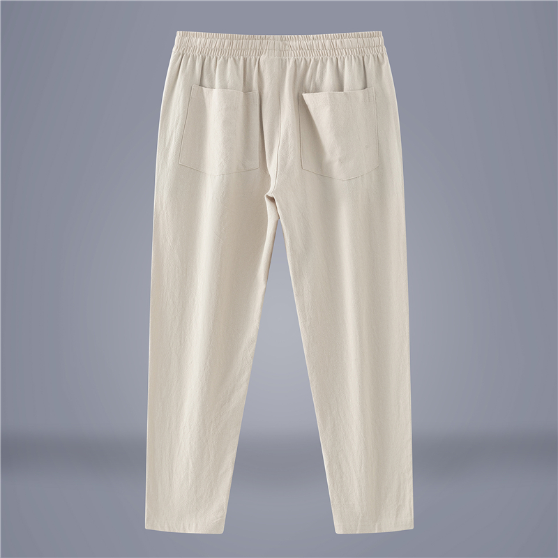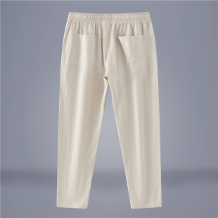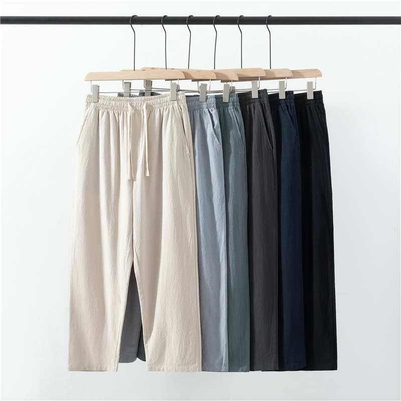 男士 日系抽绳冰丝纯麻九分裤 夏季 纯色直筒全麻休闲裤 子 薄款 亚麻裤