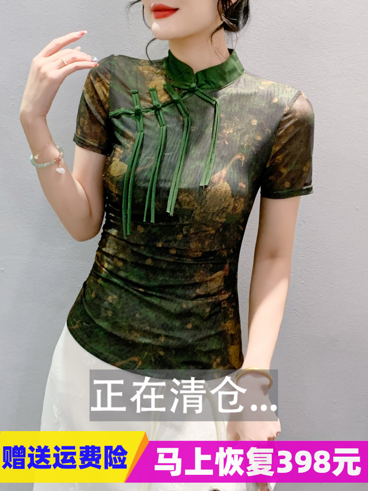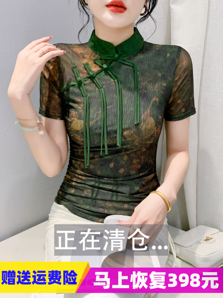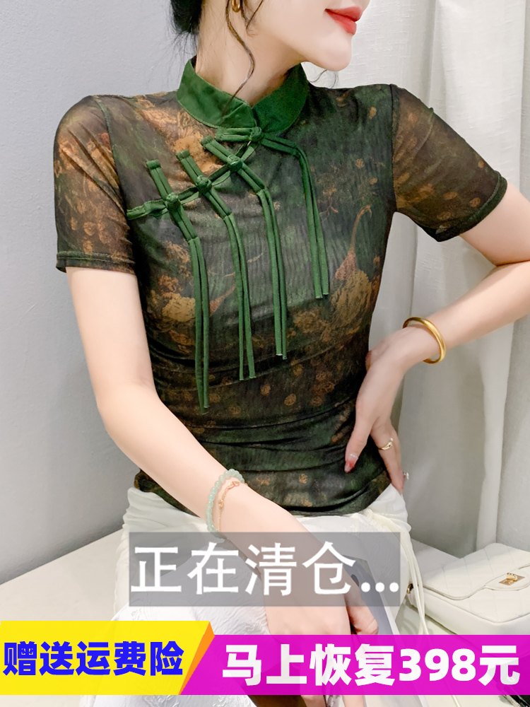 气质打底衫 新中式 修身 T恤女大码 网纱上衣 国风设计感盘扣立领短袖