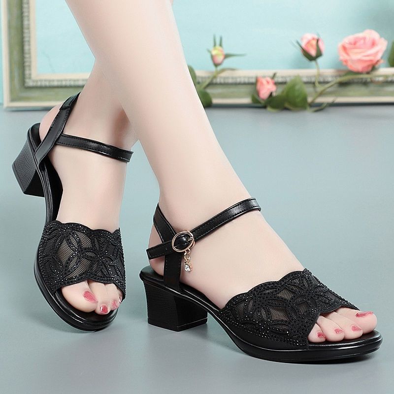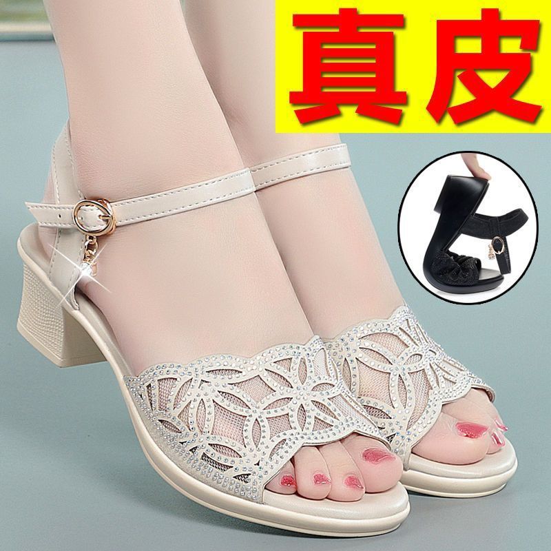 女士软底粗跟女鞋 女2024新款 中跟女式 大码 夏季 皮凉鞋 高档软皮凉鞋