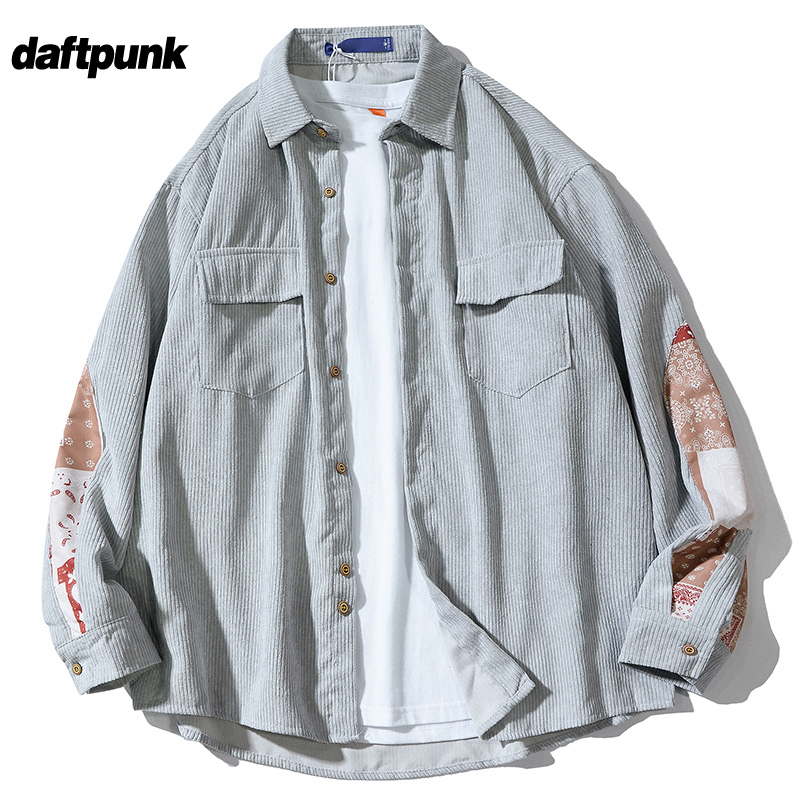 新款 男女秋季 港风复古灯芯绒外套宽松休闲拼接上衣 衬衫 腰果花长袖