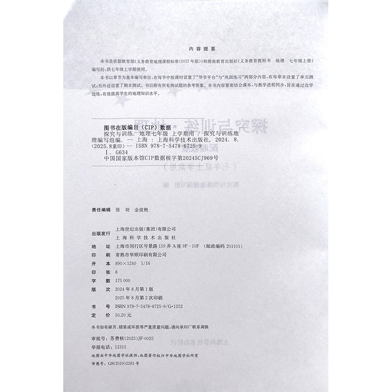 社含参考答案7年级上册初一上册 探究与训练地理七年级上学期用上海科学技术出版 封面破损 内容完好2025年秋湘教版