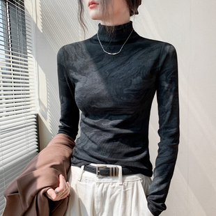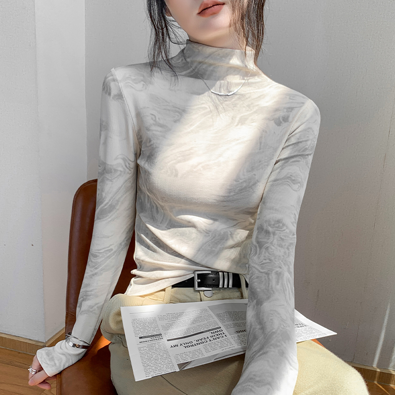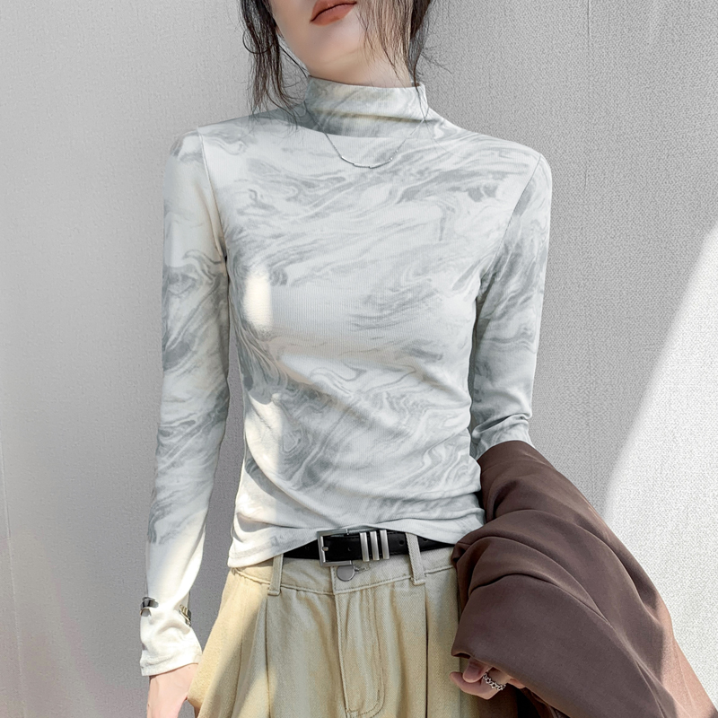 内搭打底衫 扎染水墨画半高领长袖 设计感印花修身 新款 T恤女秋冬季