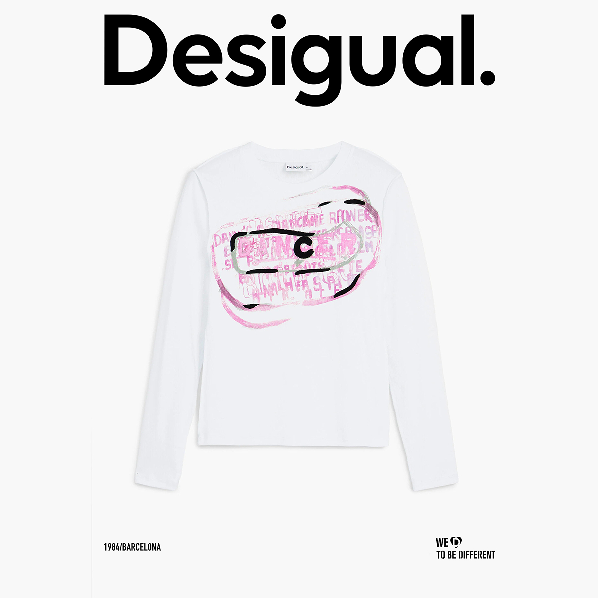 Desigual撞色印花植绒坑条弹力圆领长袖 女士T恤