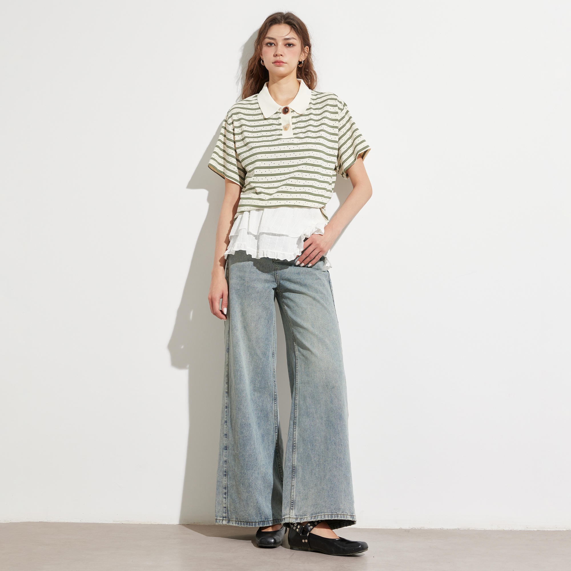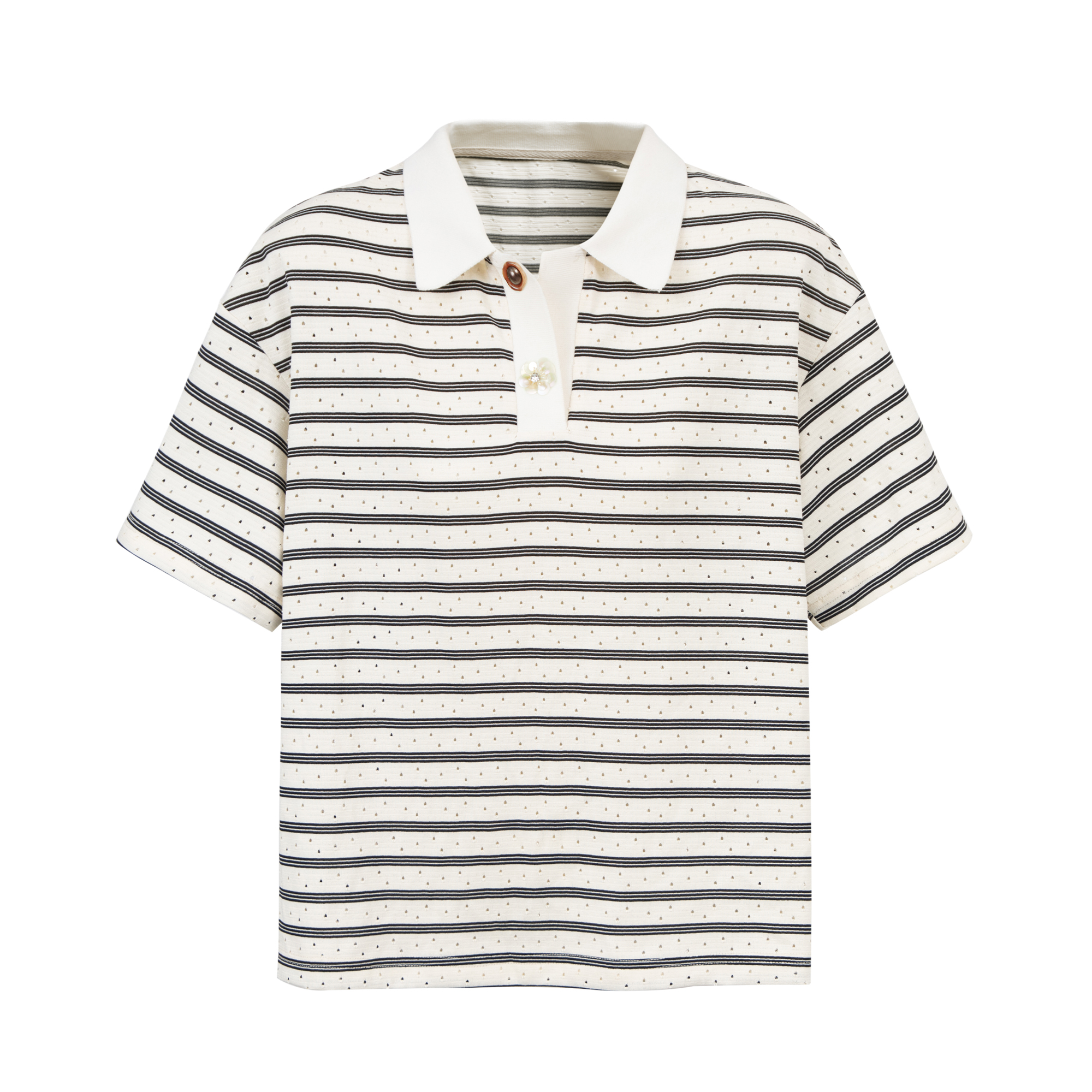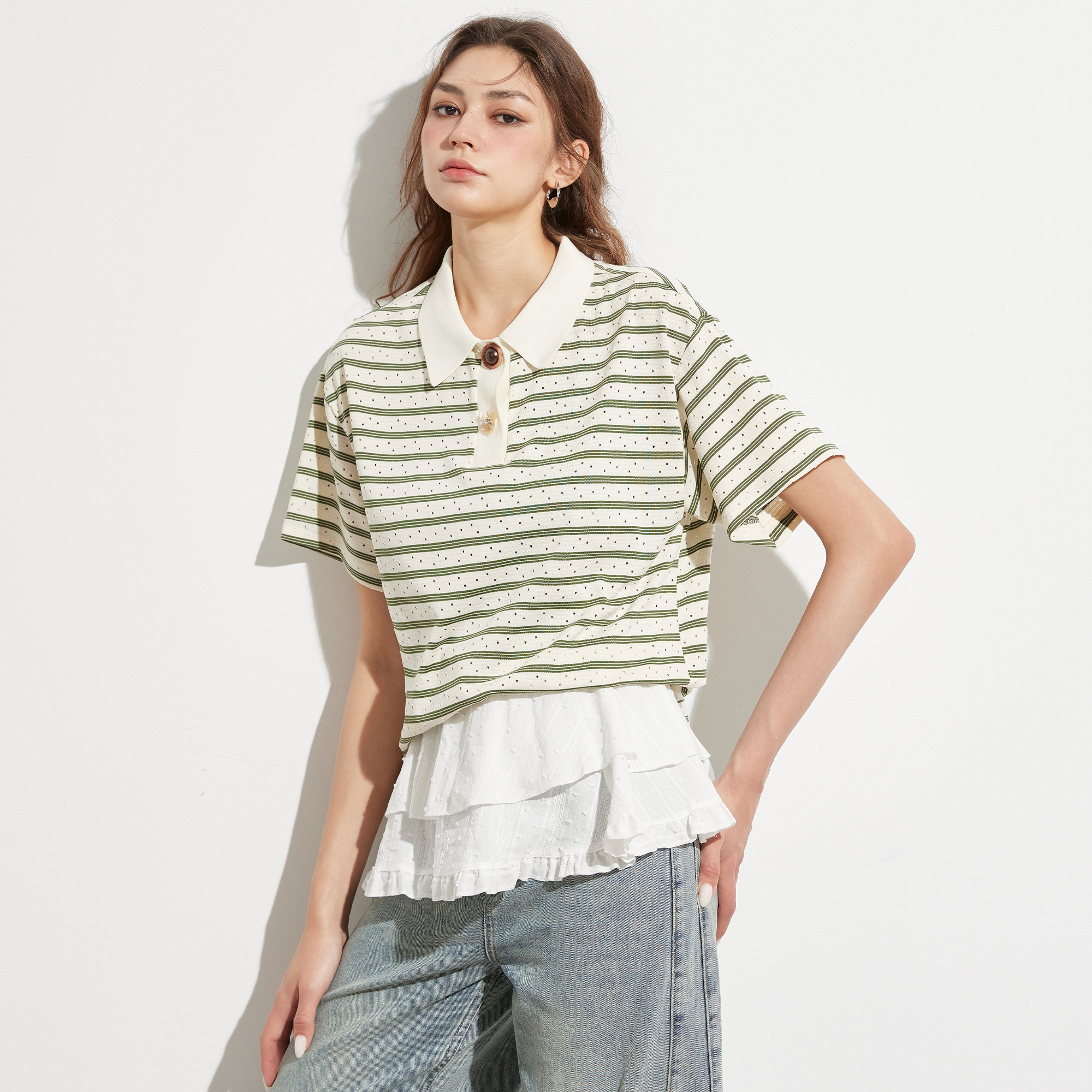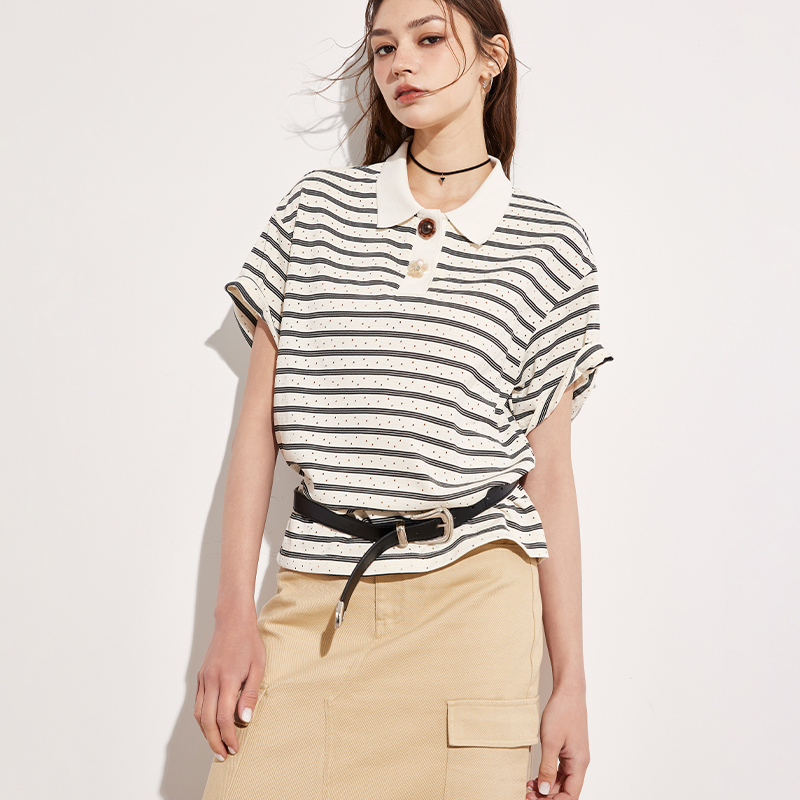 T恤女2025夏减龄镂空上衣 百家好撞色条纹polo领短袖 Basic House