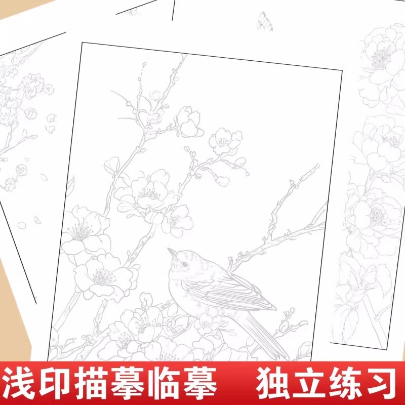 儿童中国画白描入门描摹本国画国风工笔古风花卉人物动物山水画临摹练习本美术鉴赏套装 图册描红本初学者画画临摹画册硬笔绘画练习