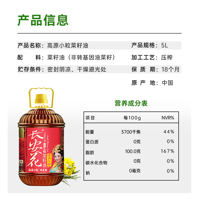 长安花物理压榨浓香菜籽油5L家用醇香正宗食用油高原小粒菜子油