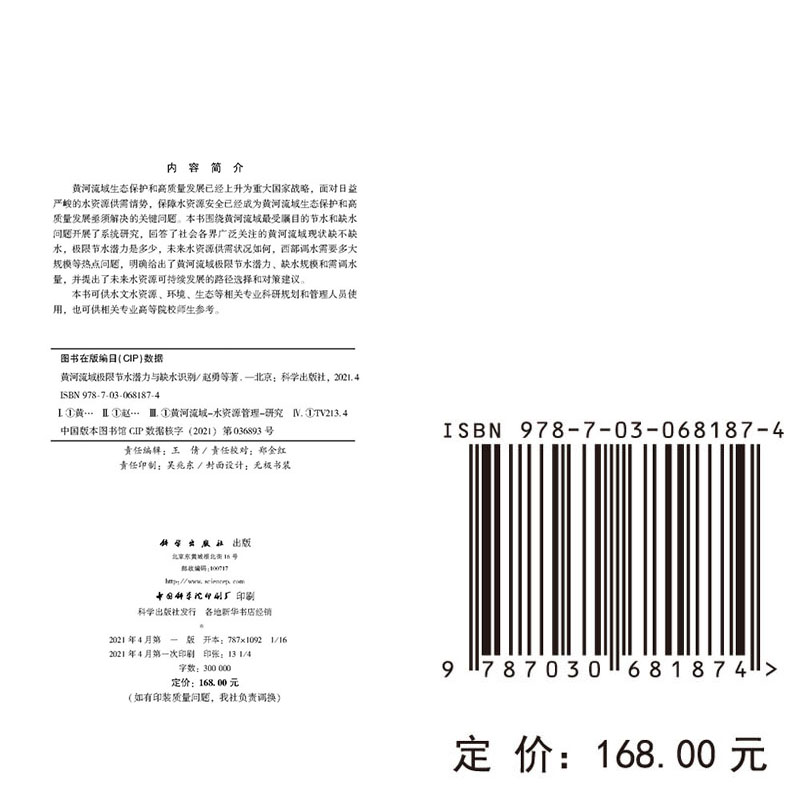 社9787030681874 黄河流域极限节水潜力与缺水识别赵勇等科学出版 正版 现货