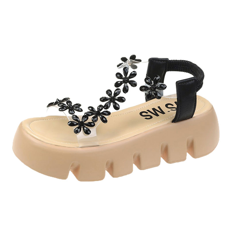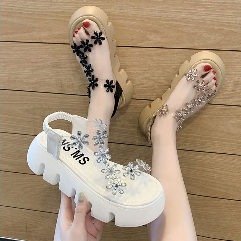 百搭水钻花朵厚底松糕鞋 仙女风凉鞋 网红时尚 新款 子潮 女2024年夏季