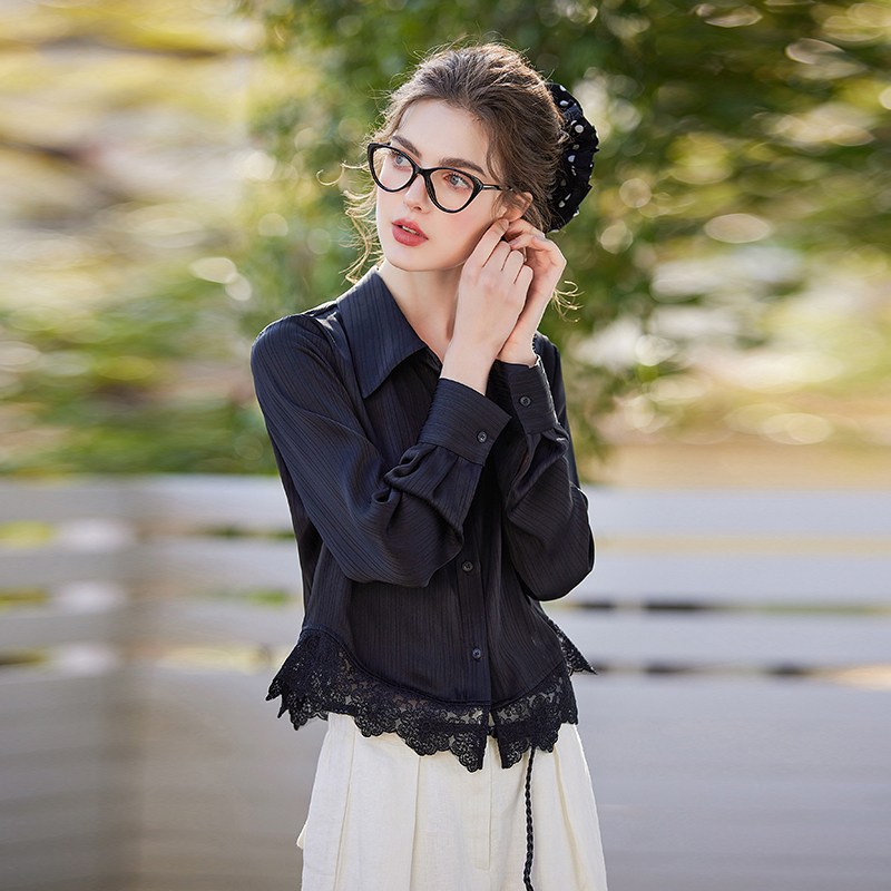 女黑色长袖 新款 上衣 收腰衬衣2025秋冬季 阔色蓝色蝴蝶结格子衬衫