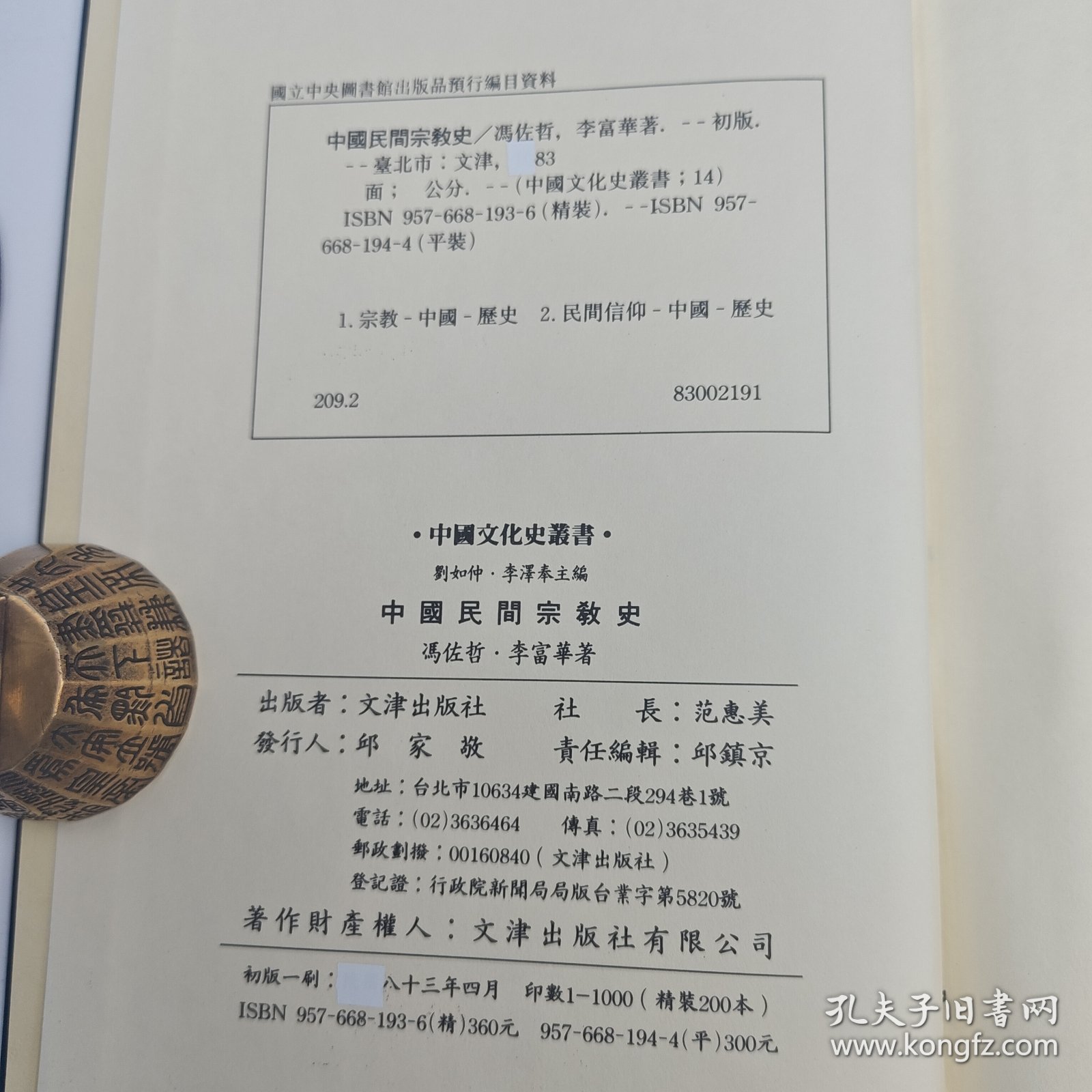 李富华 现货 ;精装 台湾文津出版 社版 自然旧 仿皮精装 印200本 正版 港台原版 冯佐哲 中國民間宗教史