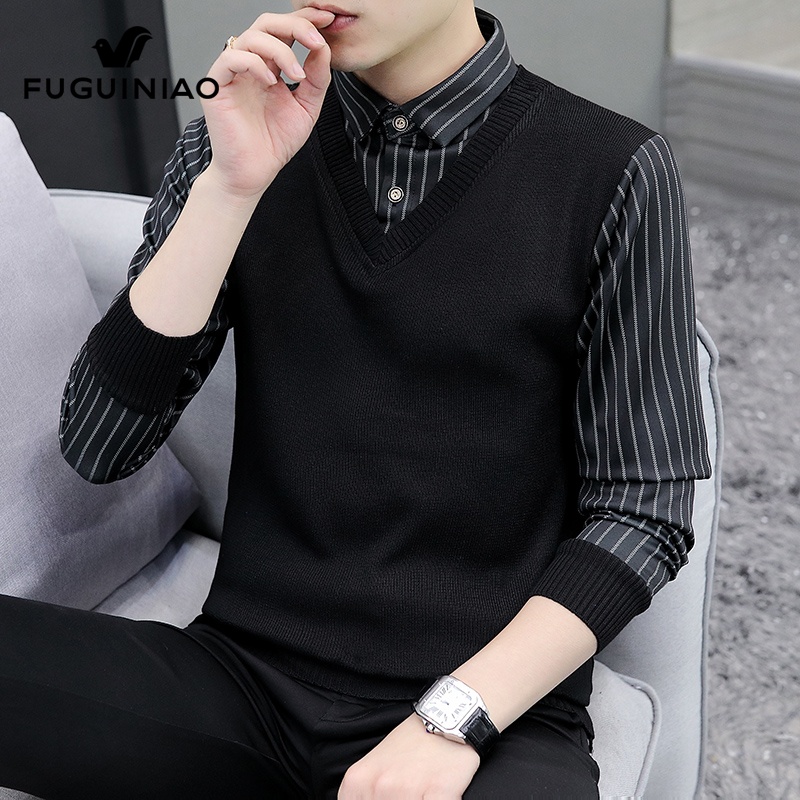 男装 富贵鸟假两件毛衣男士 领打底上衣服休闲针织衫 2025年衬衫 秋季