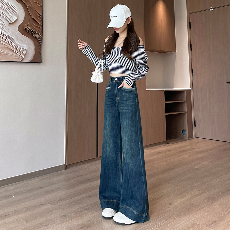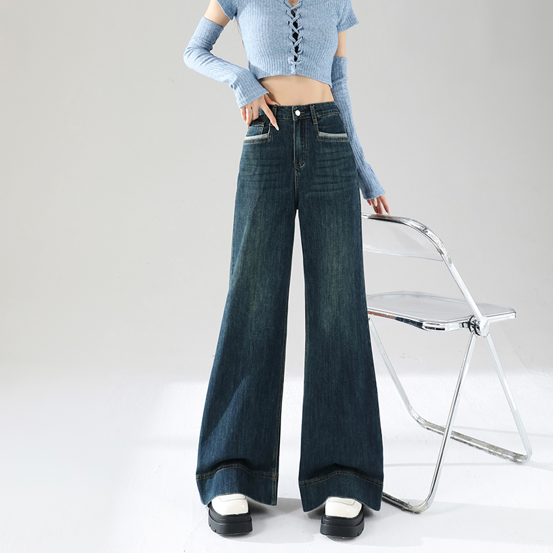 高腰显瘦弹力加绒宽松直筒拖地裤 丹宁蓝阔腿牛仔裤 女秋冬2025新款