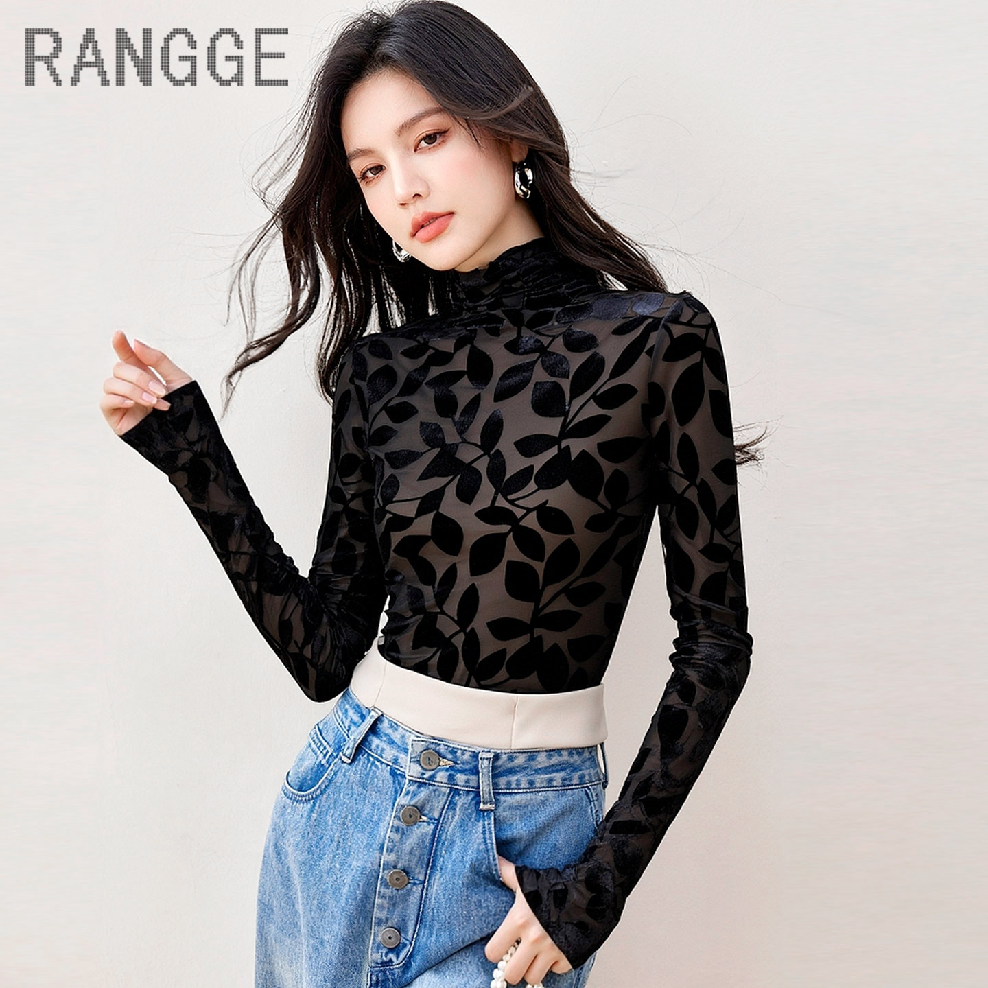 T恤 女长袖 半高领植绒网纱上衣2025秋冬新款 高级感轻熟减龄小衫