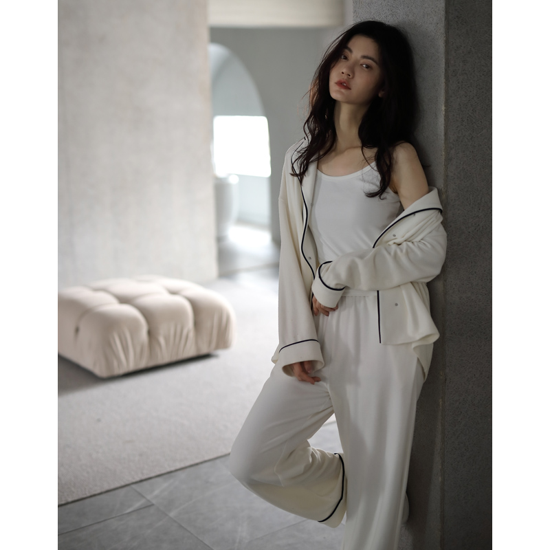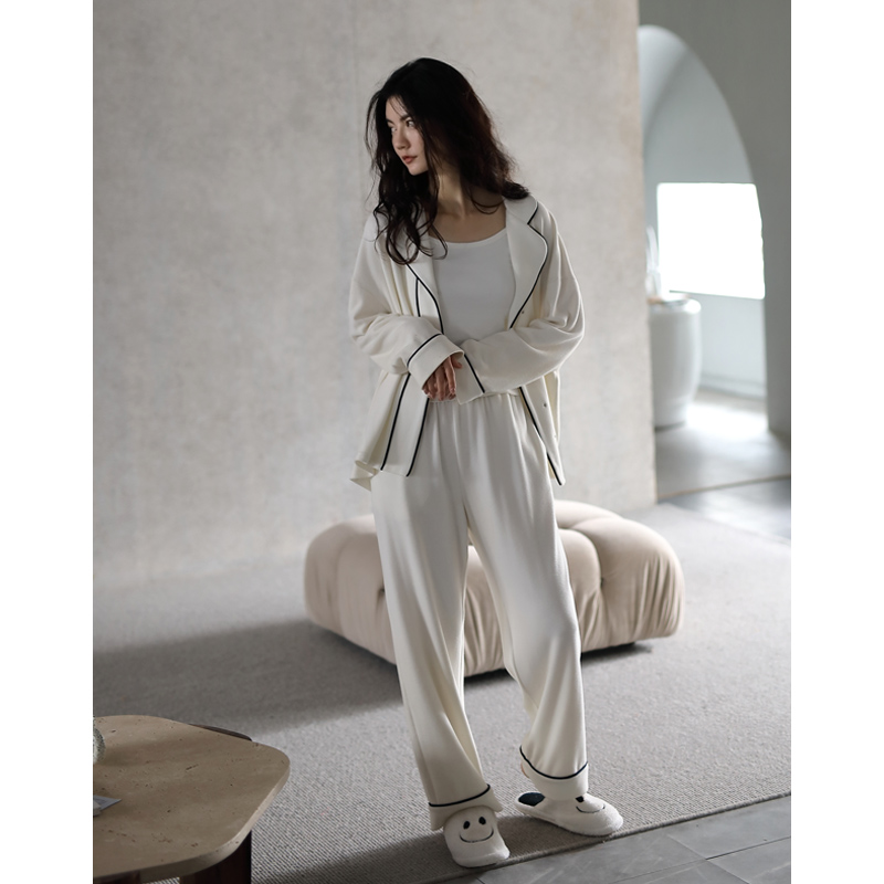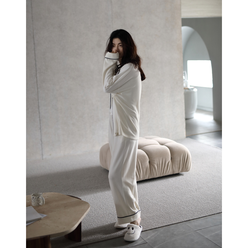 曼系睡衣女秋冬保暖珊瑚绒白色家居服简单大方时尚 宽松海岛绒套装
