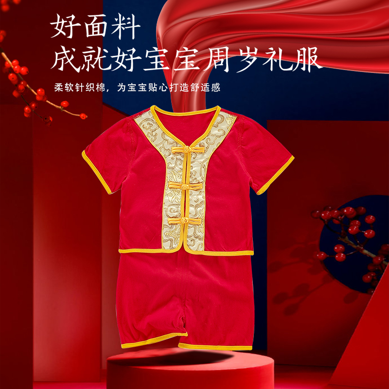 百天满月周岁抓周礼服 纯棉夏装 中国风婴儿衣服套装 男女宝宝短袖