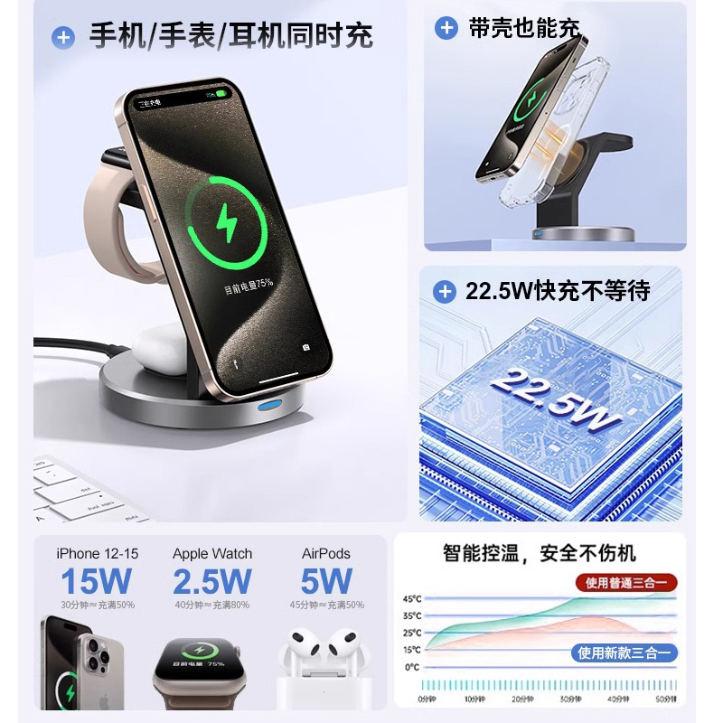 Magsafe磁吸无线充电器三合一支架多功能底座3适用苹果iPhone16手机15pro快充线iwatch手表Applewatch耳机qi2