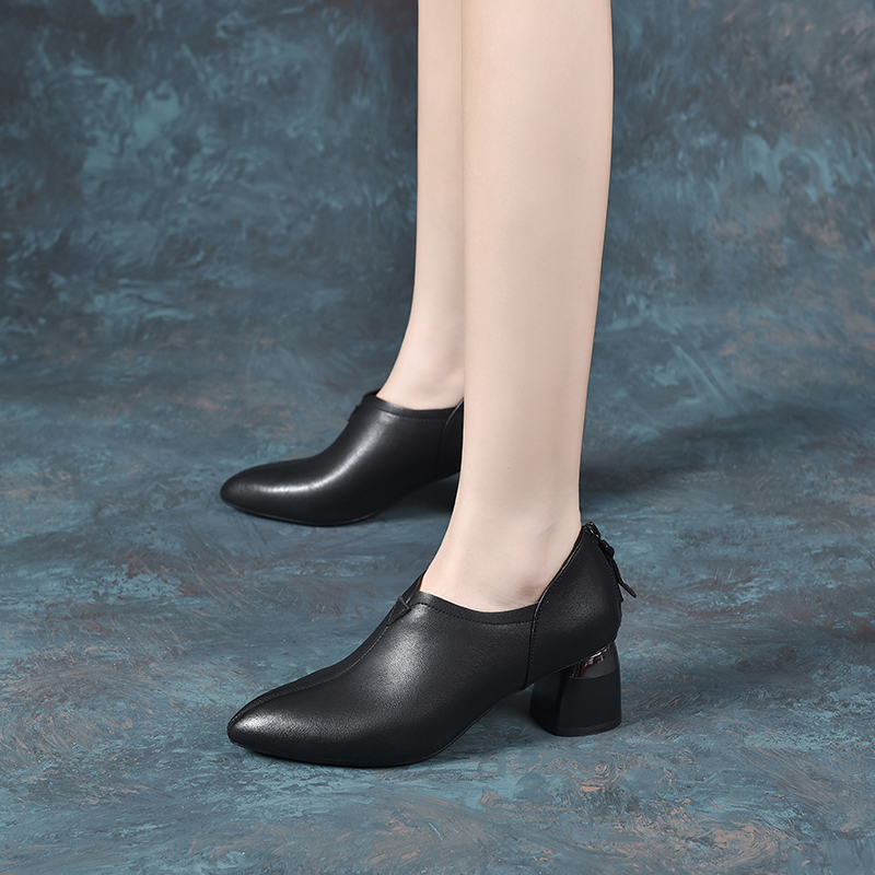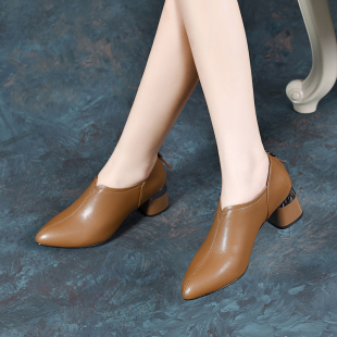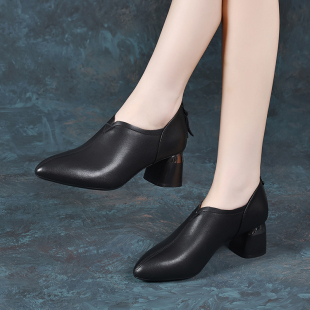 秋季 真皮女鞋 低跟深口舒适百搭单鞋 尖头粗跟女士鞋 软底 春秋新款