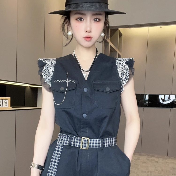 V领格子腰带收腰裤 连体短裤 纯色蕾丝拼接连体裤 新款 子 女2025春季
