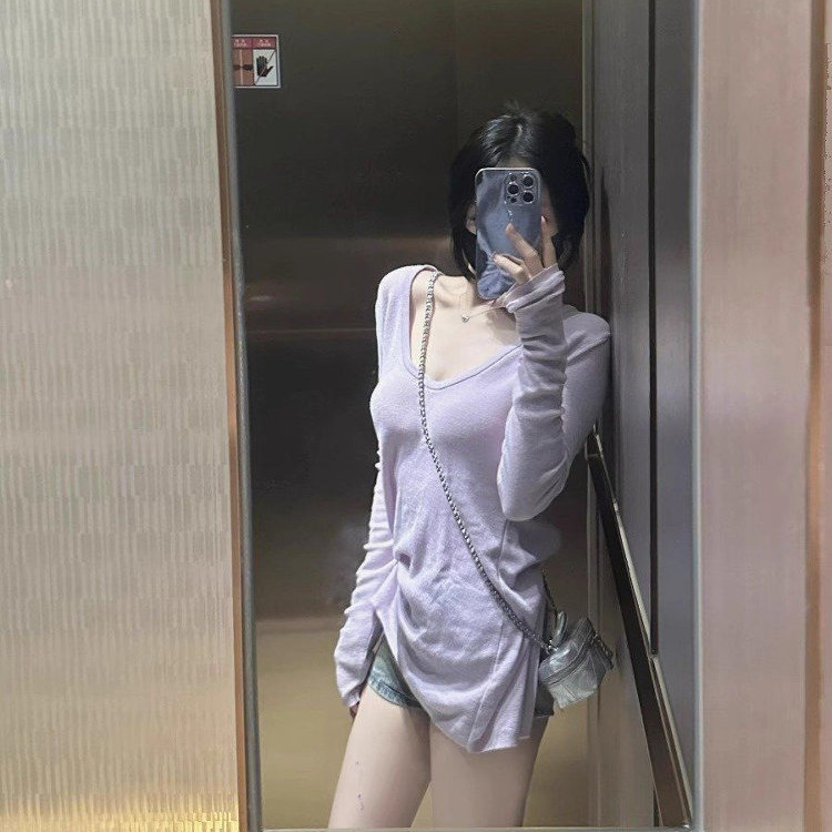 紫色长袖 甜辣妹u领防晒罩衫 T恤女夏季 修身 内搭打底上衣 新款 基础款