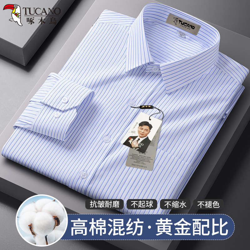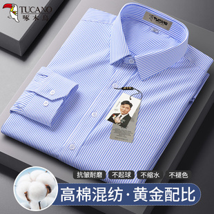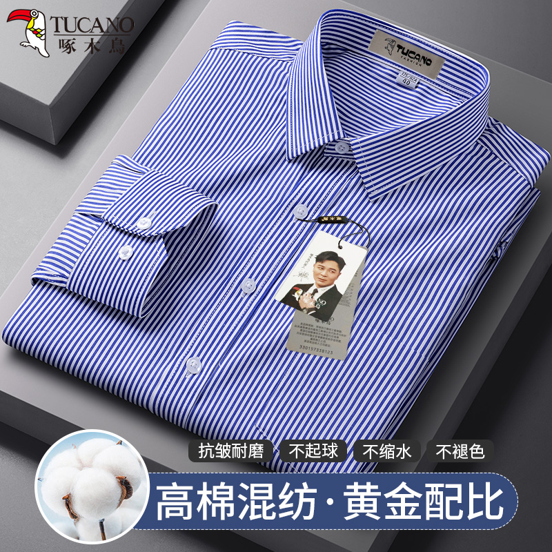 蓝色条纹男款 春夏薄款 长袖 中年休闲正装 有口袋 免烫衬衫 啄木鸟新款