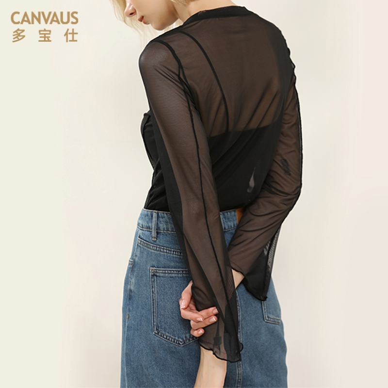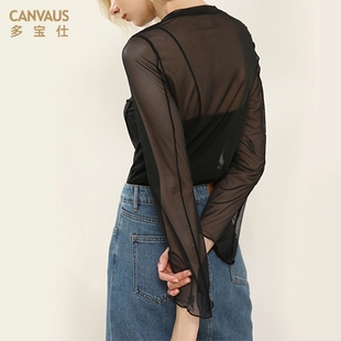 性感圆领修身 多宝仕秋新款 女长袖 网纱打底衫 透视上衣 叠穿黑色薄款