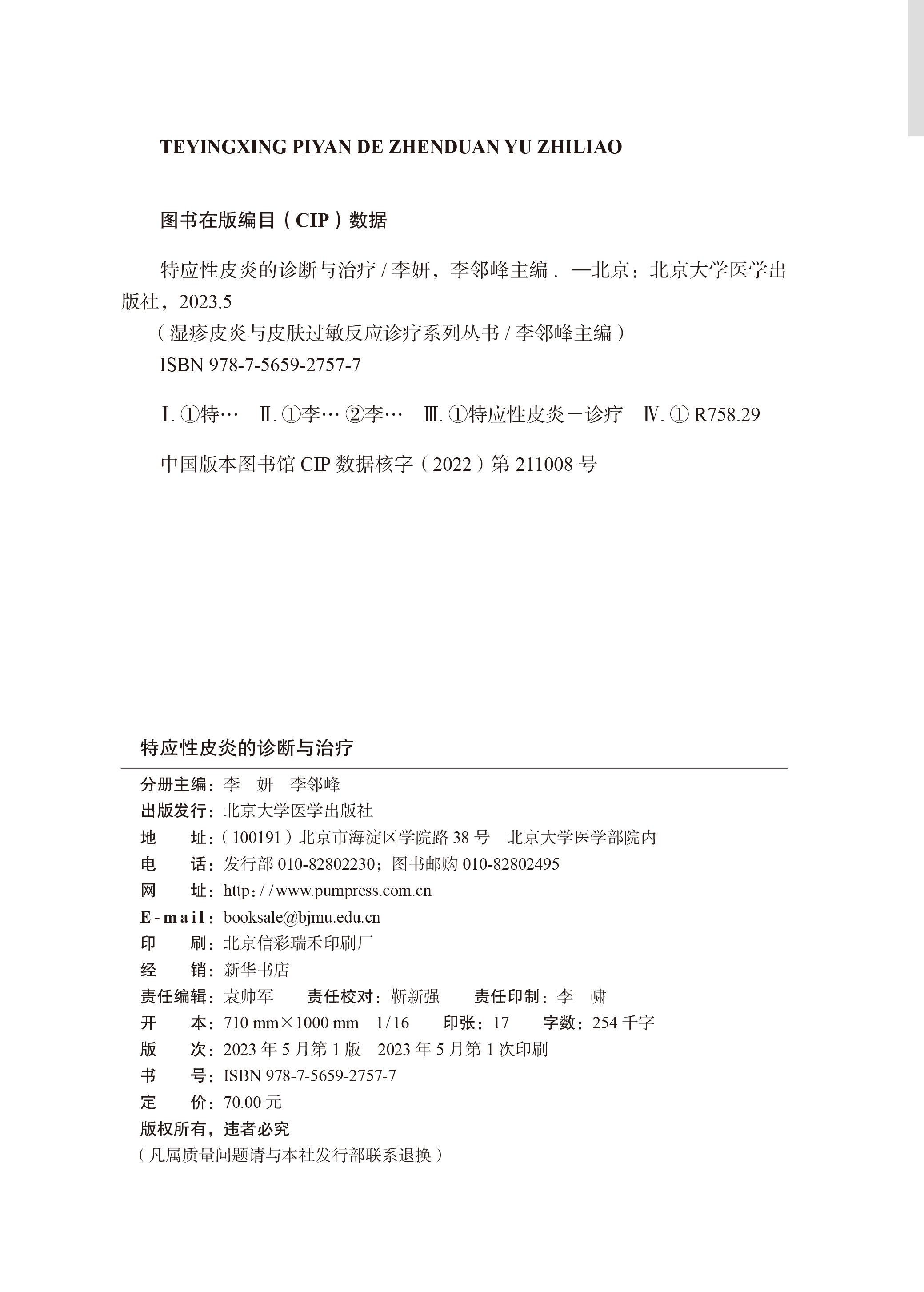 李邻峰 李妍 湿疹皮炎与皮肤过敏反应诊疗系列丛书 皮肤科医生指导书 社9787565927577 特应性皮炎 北京大学医学出版 诊断与治疗