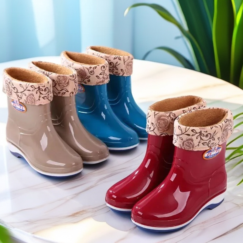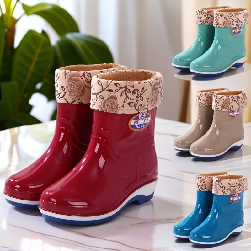 可拆洗加绒胶鞋 防滑新款 厨房雨靴水靴 女士耐磨高筒防水鞋 中筒雨鞋