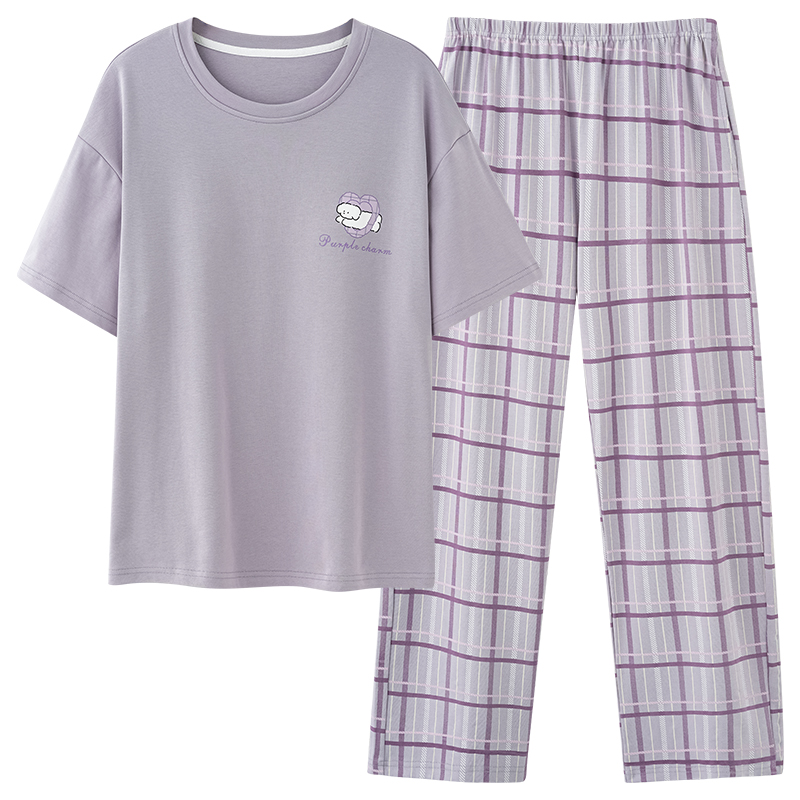 夏季 女款 纯棉短袖 家居服套装 可外穿 长裤 猫人带胸垫睡衣女2025新款