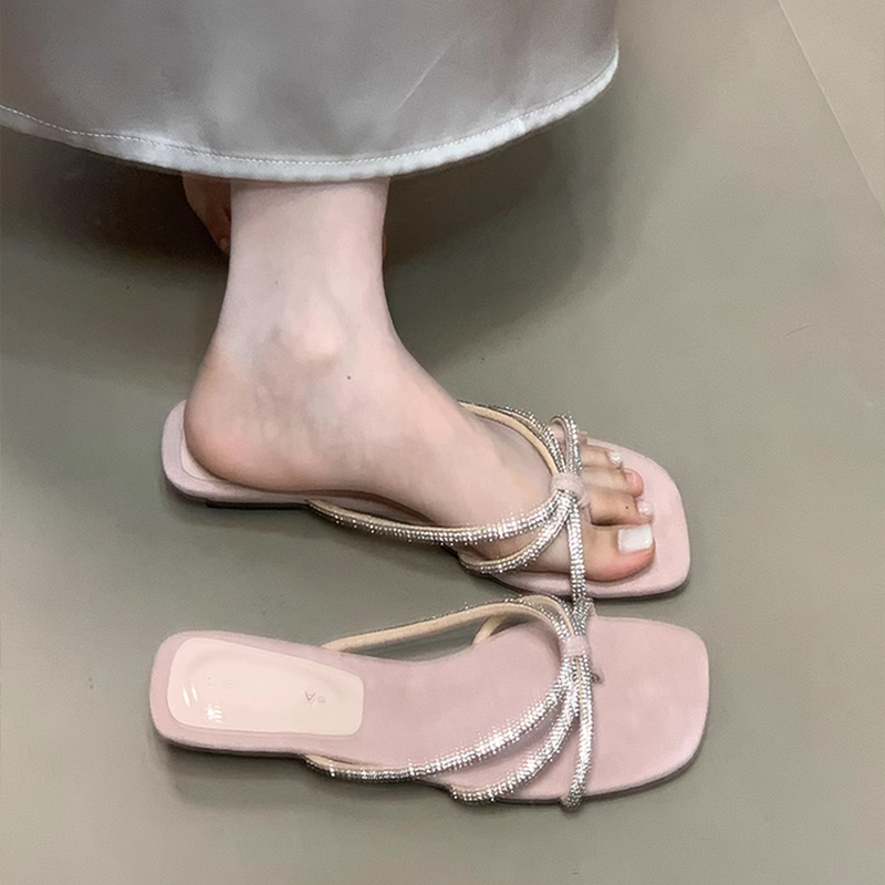一字拖鞋 配裙子凉鞋 女夏外穿2025新款 夹趾细带水钻沙滩粉色凉拖鞋