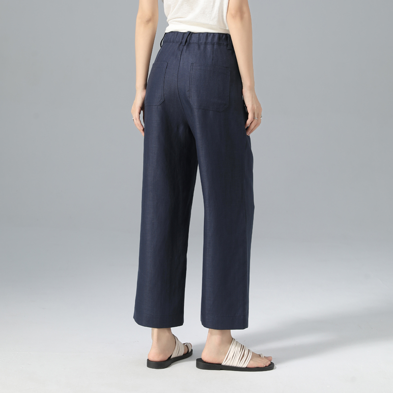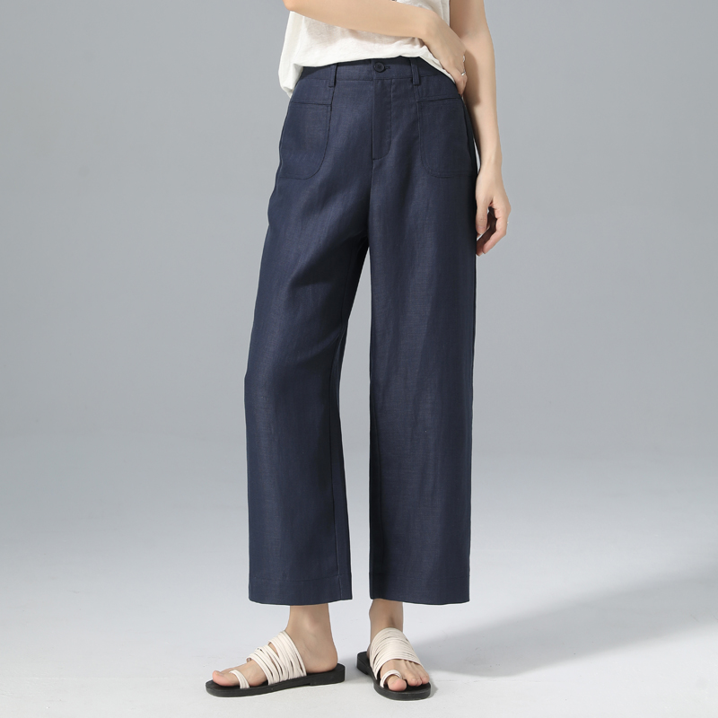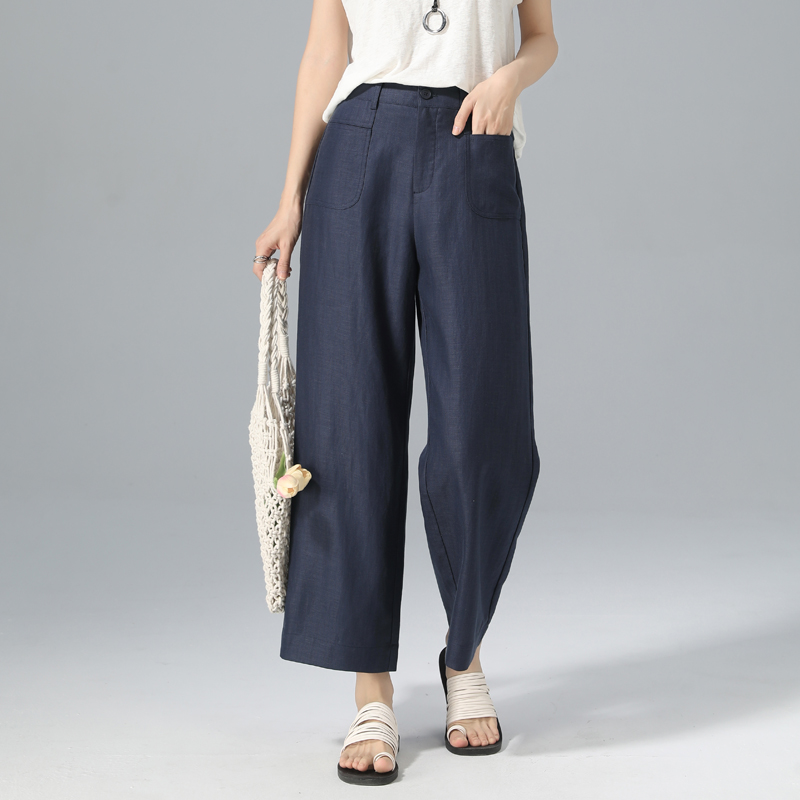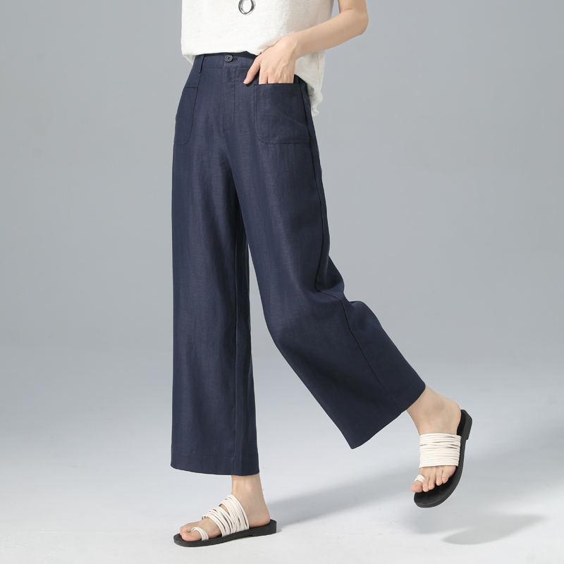女夏季 九分藏蓝色裤 薄款 高腰宽松直筒裤 子 2025新款 天丝亚麻阔腿裤