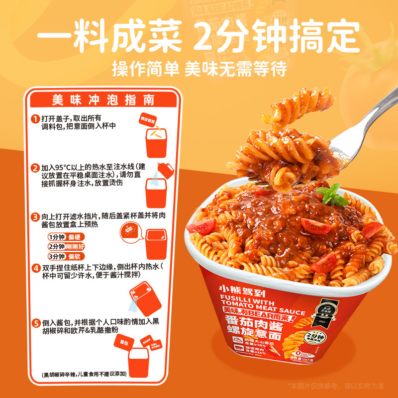 小熊驾到冲泡意面免煮速食意大利面番茄肉酱儿童螺旋泡面螺纹拌面