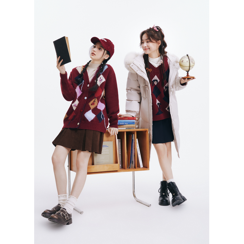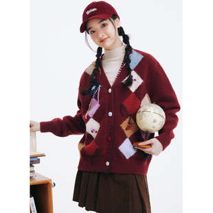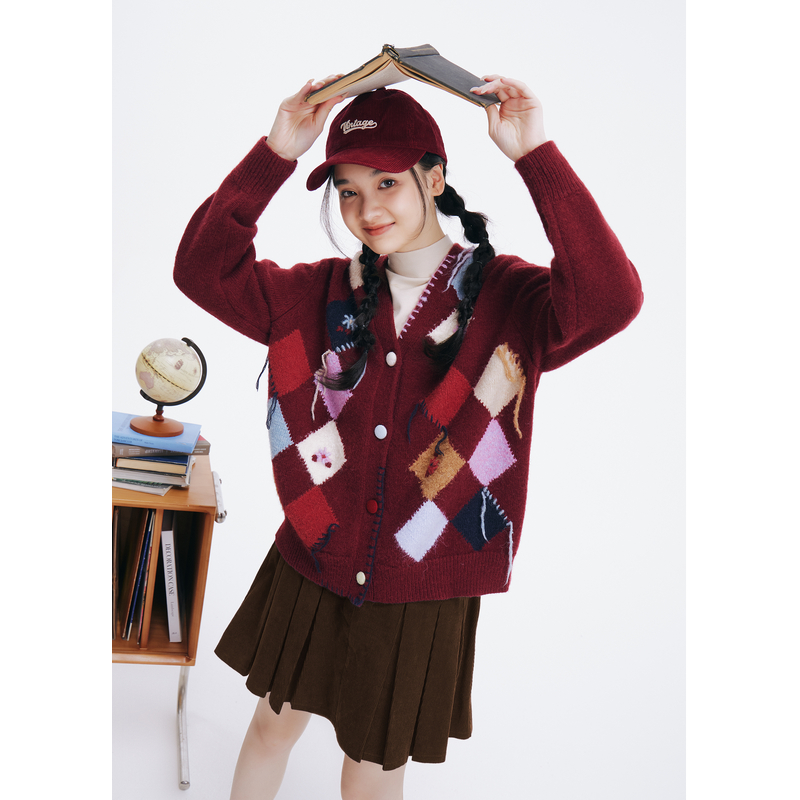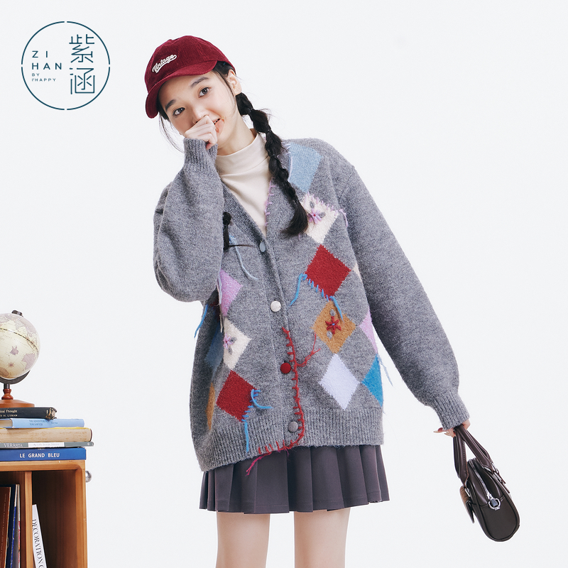 新款 冬季 设计感撞色菱格拼接毛织外套小众 V领针织开衫 紫涵宽松款