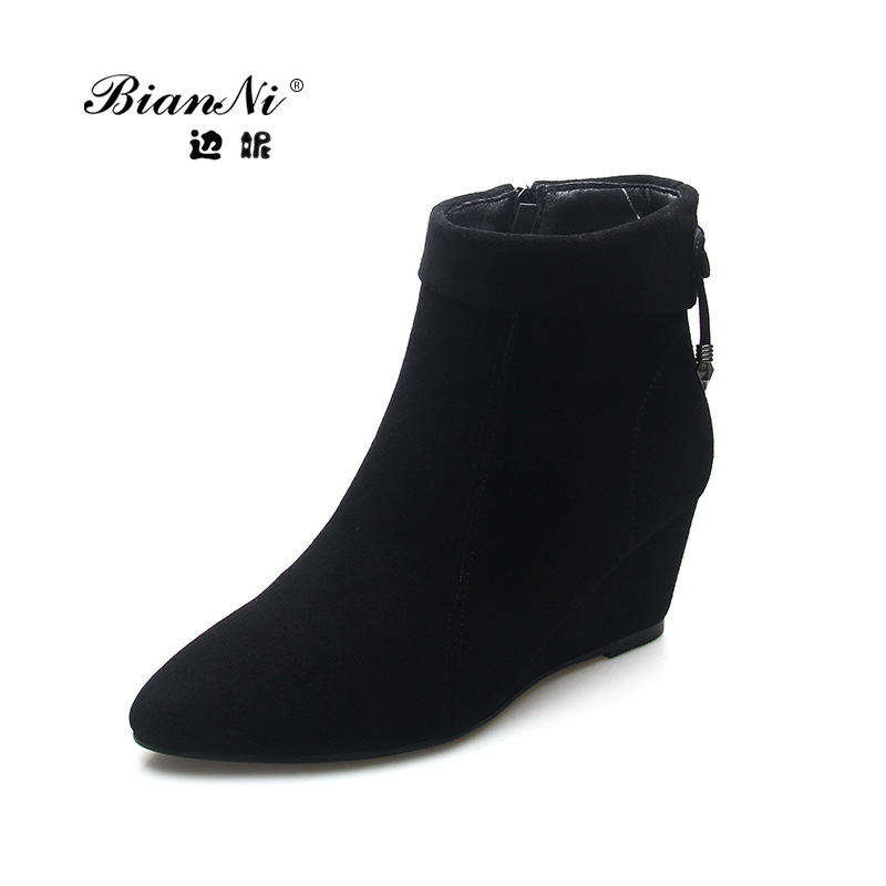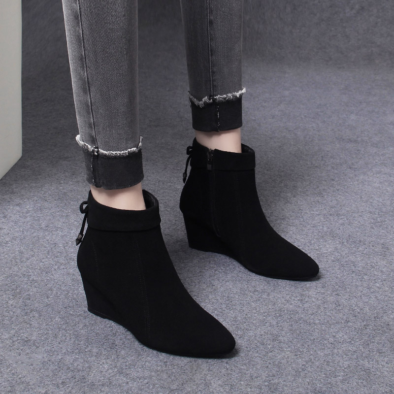 尖头坡跟短靴女绒面超软羊皮高跟鞋 秋冬女靴子春秋马丁靴 2025新款